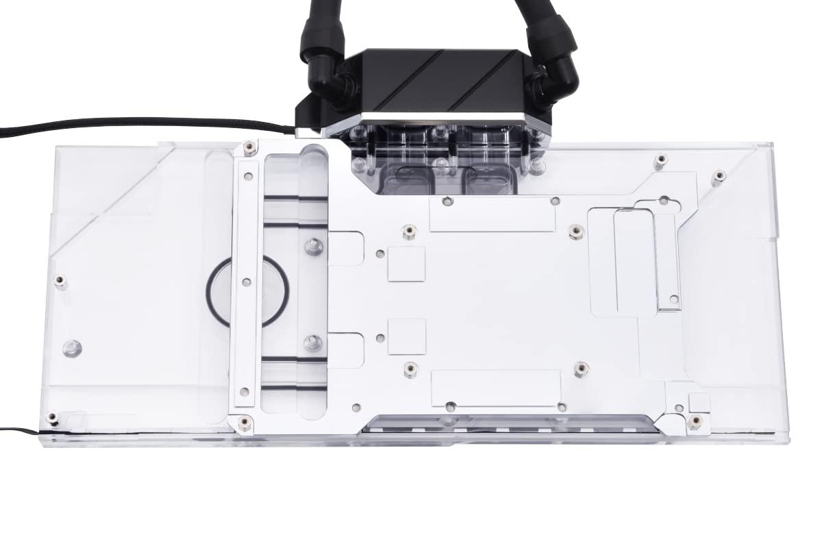 - Refrigeratore Full Cover Il refrigeratore d'acqua AIO della scheda video Eiswolf 2 raffredda non solo la GPU con acqua, ma tutti i componenti rilevanti che richiedono un raffreddamento attivo. Ciò include la memoria grafica, i convertitori di tensione e se ci sono altri componenti che richiedono un raffreddamento diretto.
