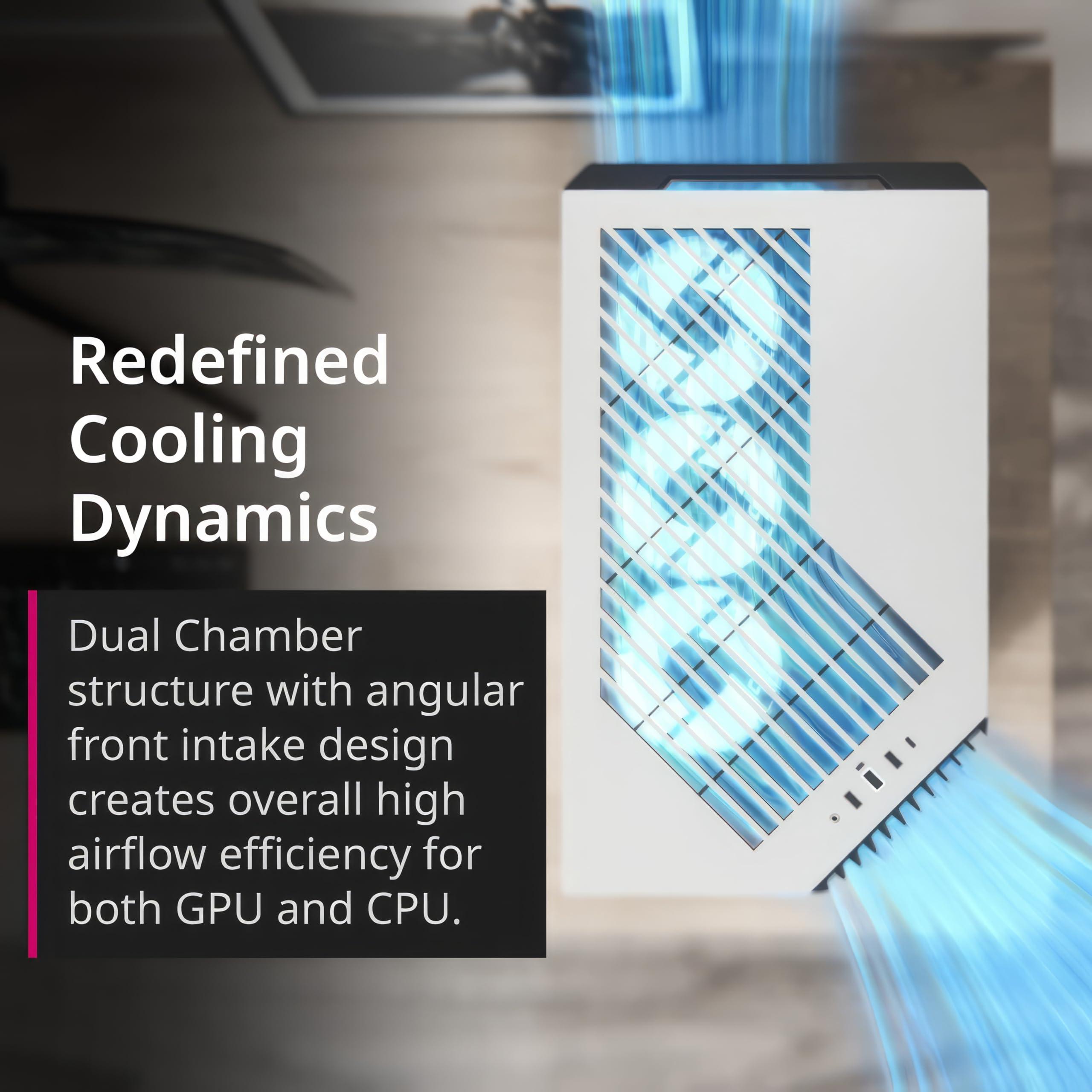 - Struttura panoramica a doppia camera con design angolare di aspirazione frontale a 45° - Migliora l'efficienza complessiva del flusso d'aria sia per GPU che per CPU, fornendo al contempo un aspetto elegante e organizzato. Il pannello di aspirazione frontale angolare può ospitare ventole fino a 3 x 12 cm, 2 x 14 cm o 2 x 16 cm, offrendo flessibilità per configurazioni di raffreddamento ottimali.