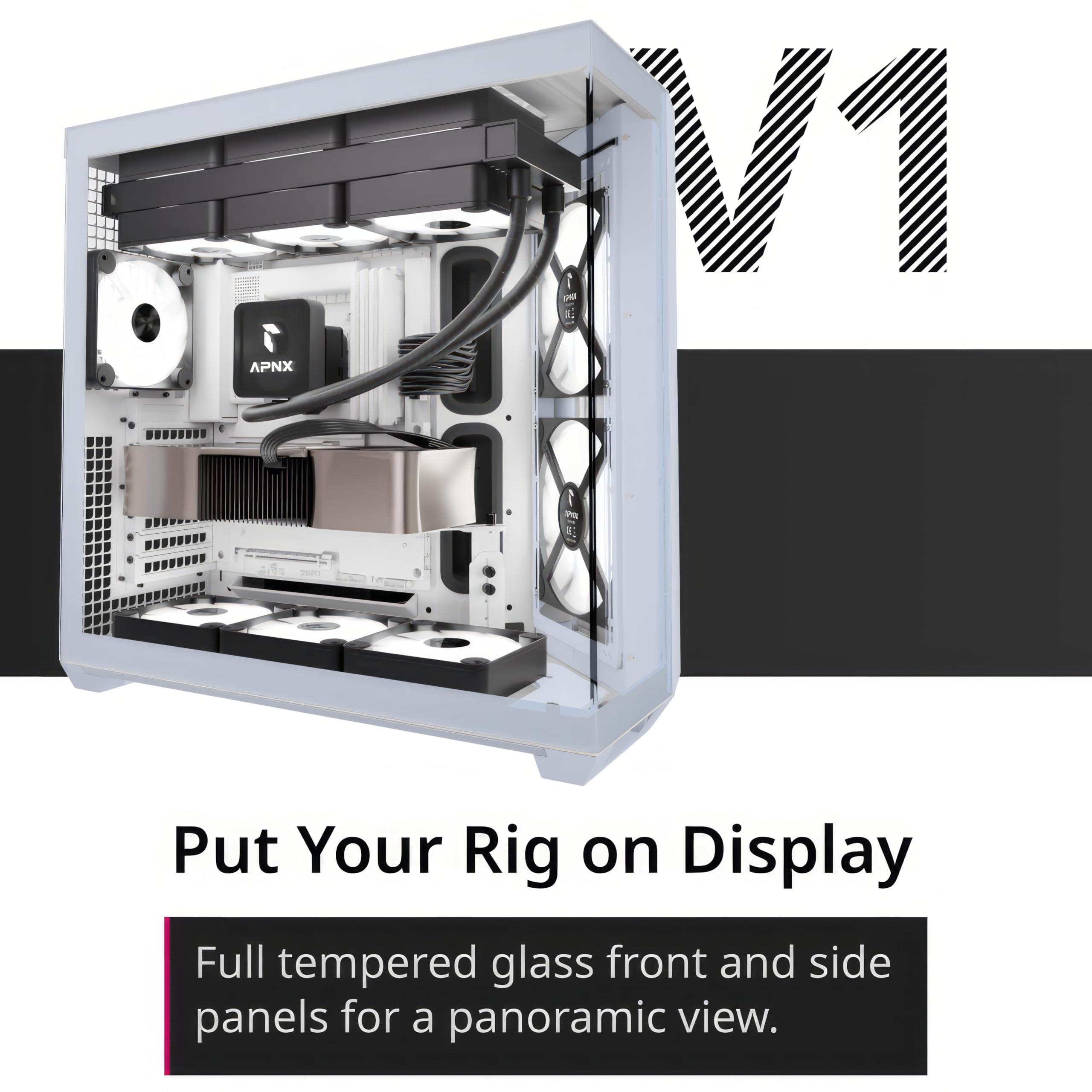 La custodia mid-tower APNX V1 offre prestazioni eccezionali ed estetica elegante. La sua struttura a doppia camera e il design angolare di aspirazione a 45° accentuano un ambiente progettato per il raffreddamento. La scheda madre regolabile ti dà il controllo del layout, mentre le staffe di raffreddamento a sgancio rapido e i filtri magnetici rimovibili garantiscono un facile accesso. Con una vista panoramica in vetro temperato, V1 è perfetto per gli amanti dei PC che cercano prestazioni con personalità.