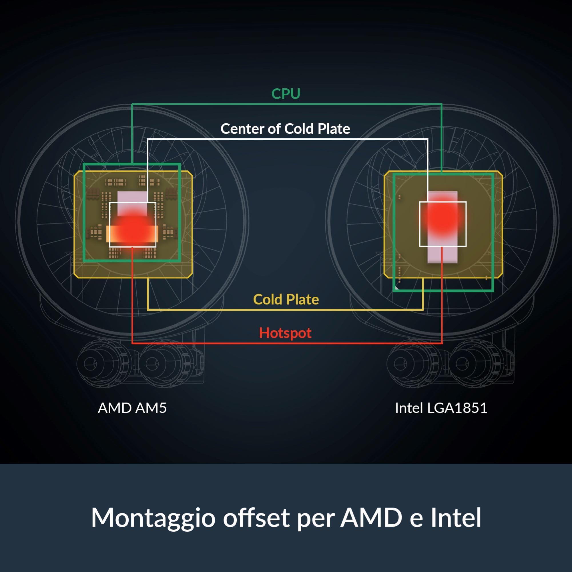- MONTAGGIO OFFSET NATIVO : lo spostamento del centro della piastra di raffreddamento verso il punto caldo della CPU garantisce un trasferimento del calore più efficiente.