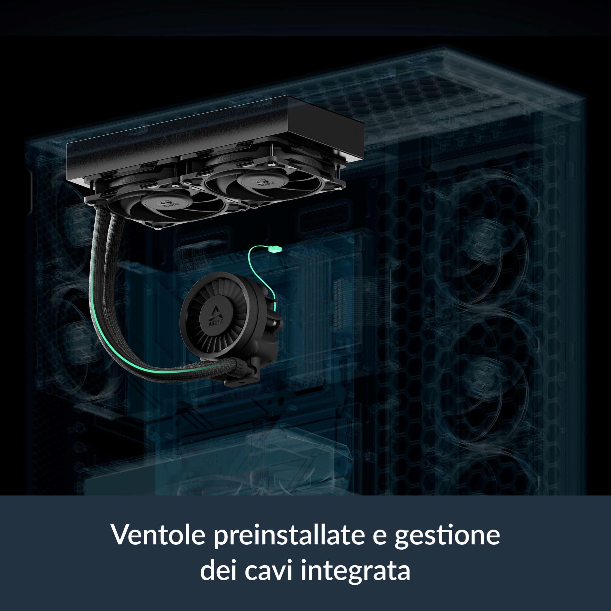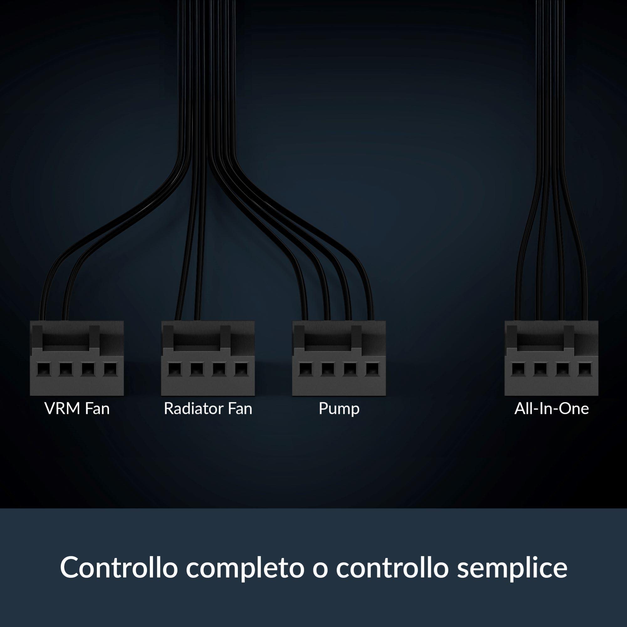 - CABLE MANAGEMENT INTEGRATO: i cavi PWM delle ventole del radiatore sono integrati nella guaina dei tubi, in modo da collegare alla scheda madre un solo cavo visibile.
