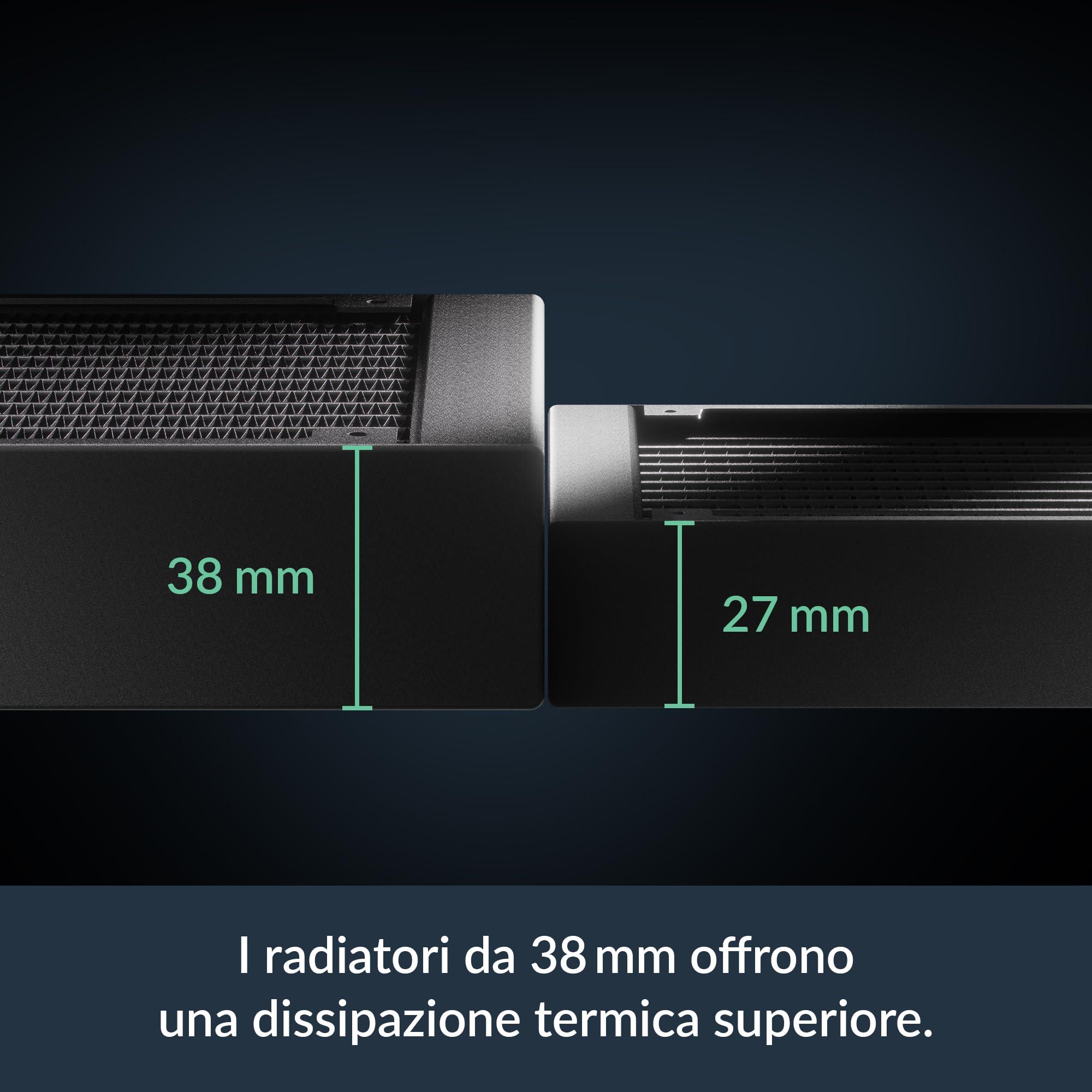 - Radiatore di classe premium: i raffreddatori a liquido con radiatori da 38 mm offrono una dissipazione termica superiore e abbiamo integrato questo design nei nostri modelli di postazioni di lavoro.