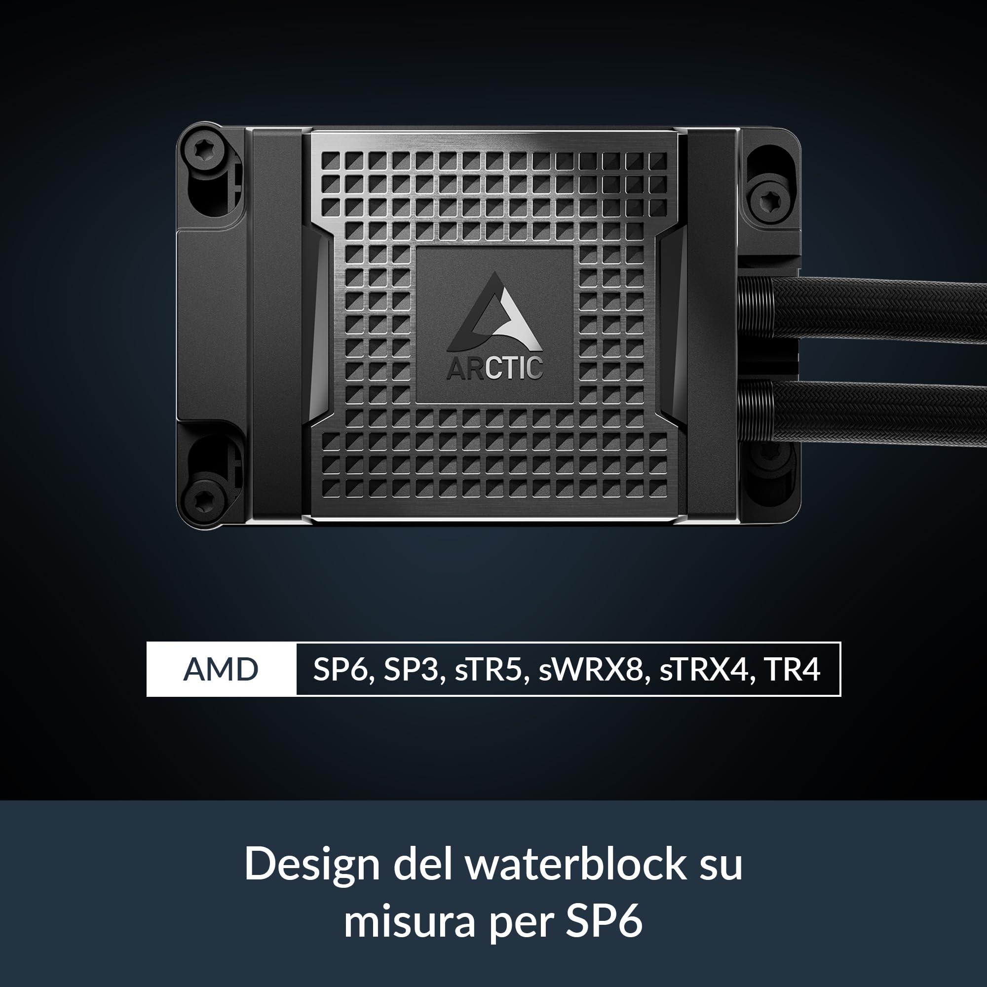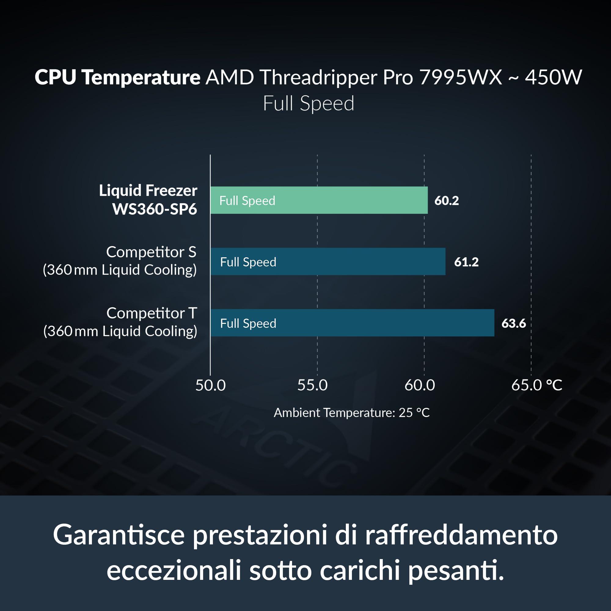 - Progettato per un raffreddamento di livello superiore e ottimizzato per le workstation, il Liquid Freezer WS360-SP6 offre un raffreddamento eccezionale in presenza di carichi pesanti, mantenendo livelli di rumorosità paragonabili a quelli delle soluzioni concorrenti.