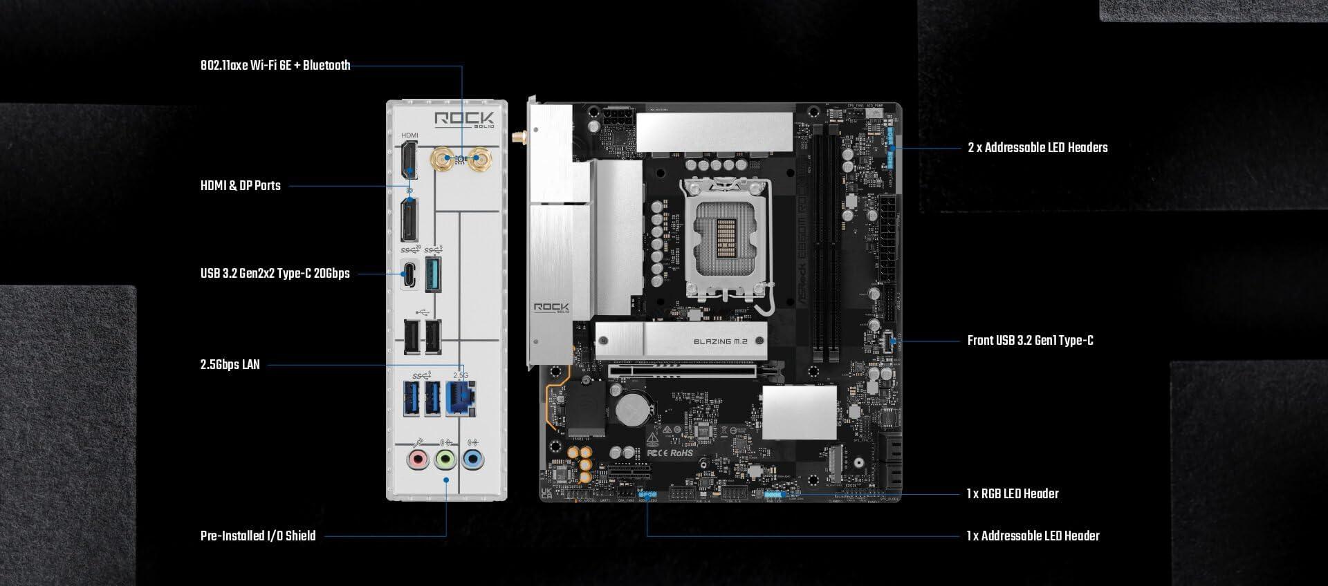 - 2.5G LAN & Wi-Fi 6E: Caratteristiche Dragon RTL8125BG 2.5G LAN con gestione intelligente della larghezza di banda e integrato 802.11axe Wi-Fi 6E + Bluetooth 5.3 per ultra-veloce, bassa latenza cablata e connettività wireless.