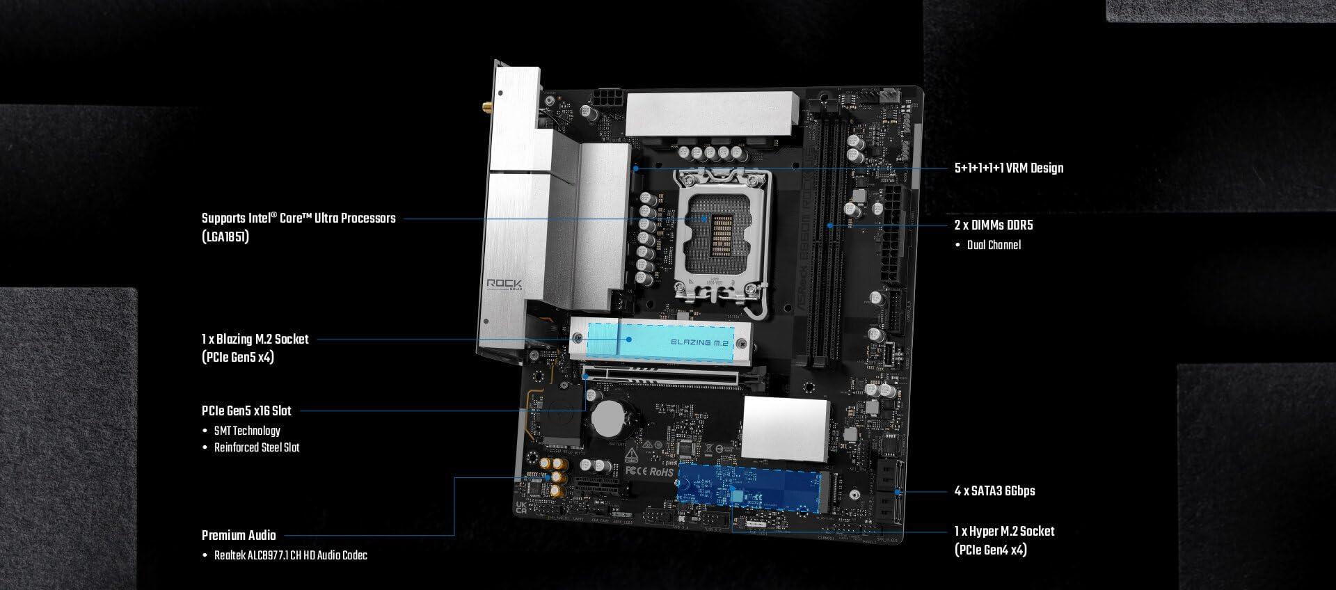 - Piattaforma Intel più recente: supporta processori Intel Core Ultra (serie 2) sul socket LGA1851 con NPU integrata per accelerazione AI dedicata, offrendo prestazioni di nuova generazione in un fattore di forma Micro-ATX compatto.