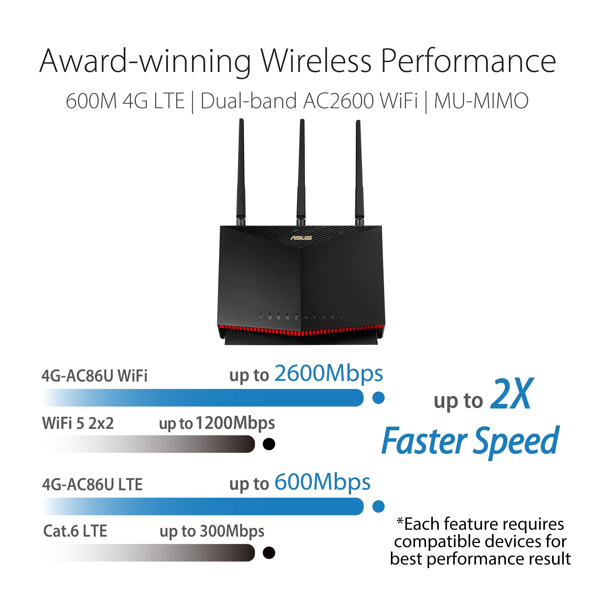 ASUS 4G-AC86U 4G+ LTE Modem Router Cat. 12 Dual-Band AC2600 mbps, Supporta Rete Ospiti con Captive Portal, Aiprotection Pro Internet Security, MU-MIMO, slot SIM