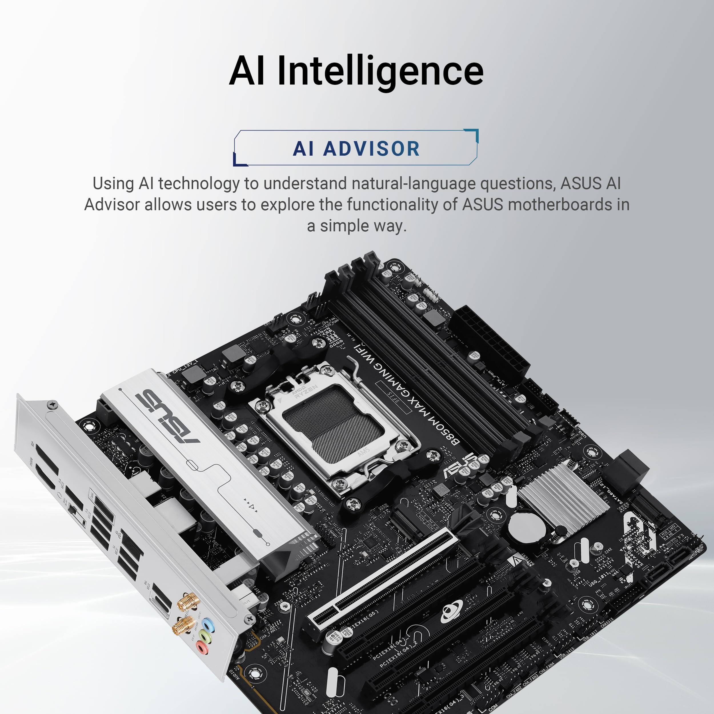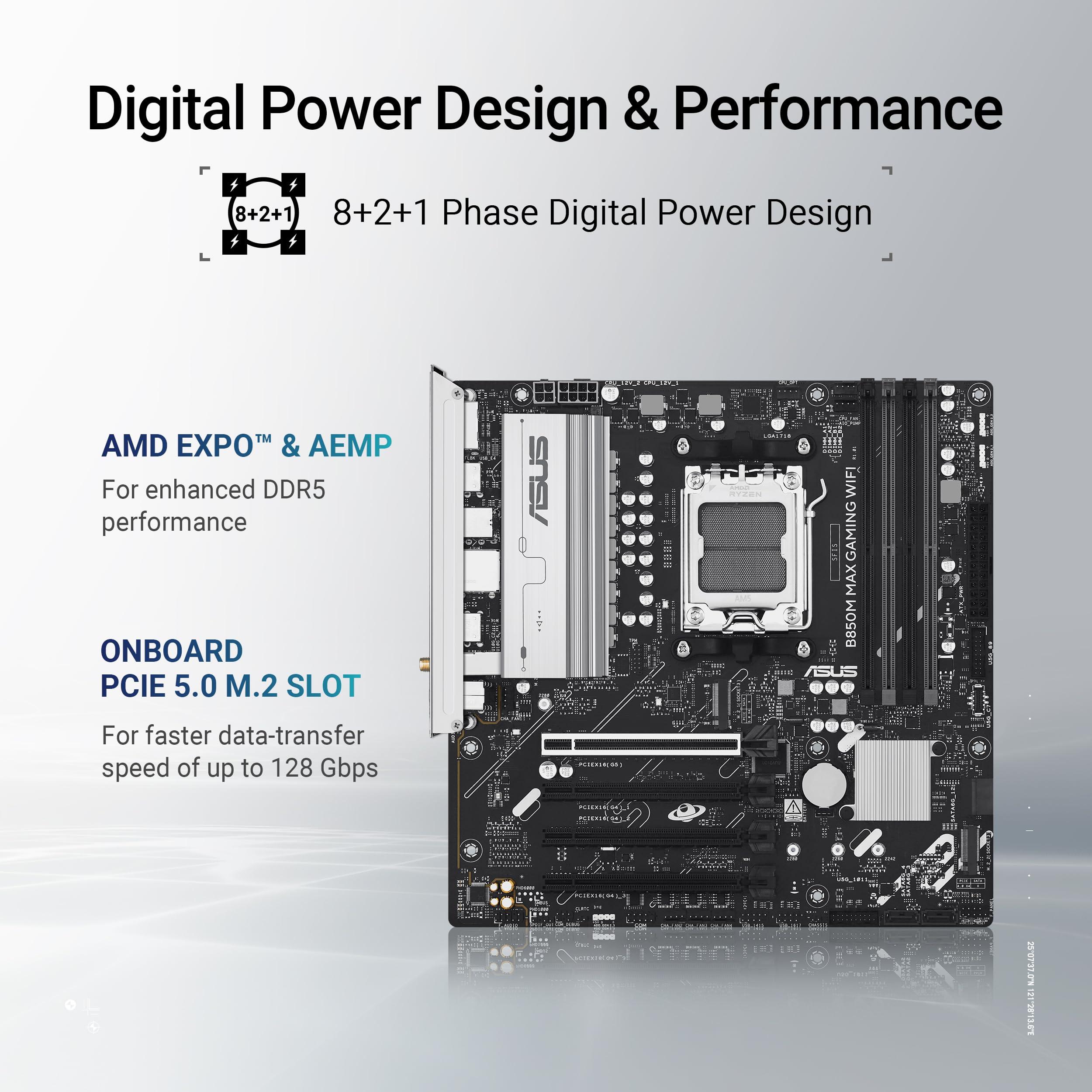 ASUS B850M MAX GAMING WIFI, Scheda Madre AMD mAMD ATX, 8+2+1 Fasi di Alimentazione, Slot DDR5, PCIe 5.0 Ready, 3 slot M.2, WiFi 6, Ethernet 1Gb, USB-A, USB-C, HDMI, BIOS Flashback e Aura Sync, Nera