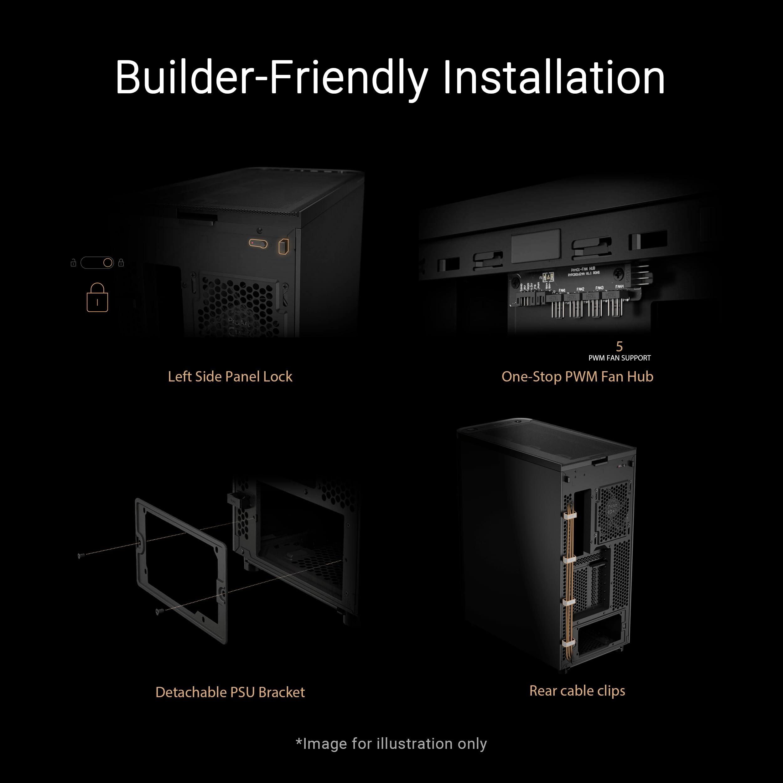 - Facile montaggio: blocco del pannello laterale sinistro, supporto dell'alimentatore rimovibile e clip per cavi posteriori integrate per un'installazione senza problemi