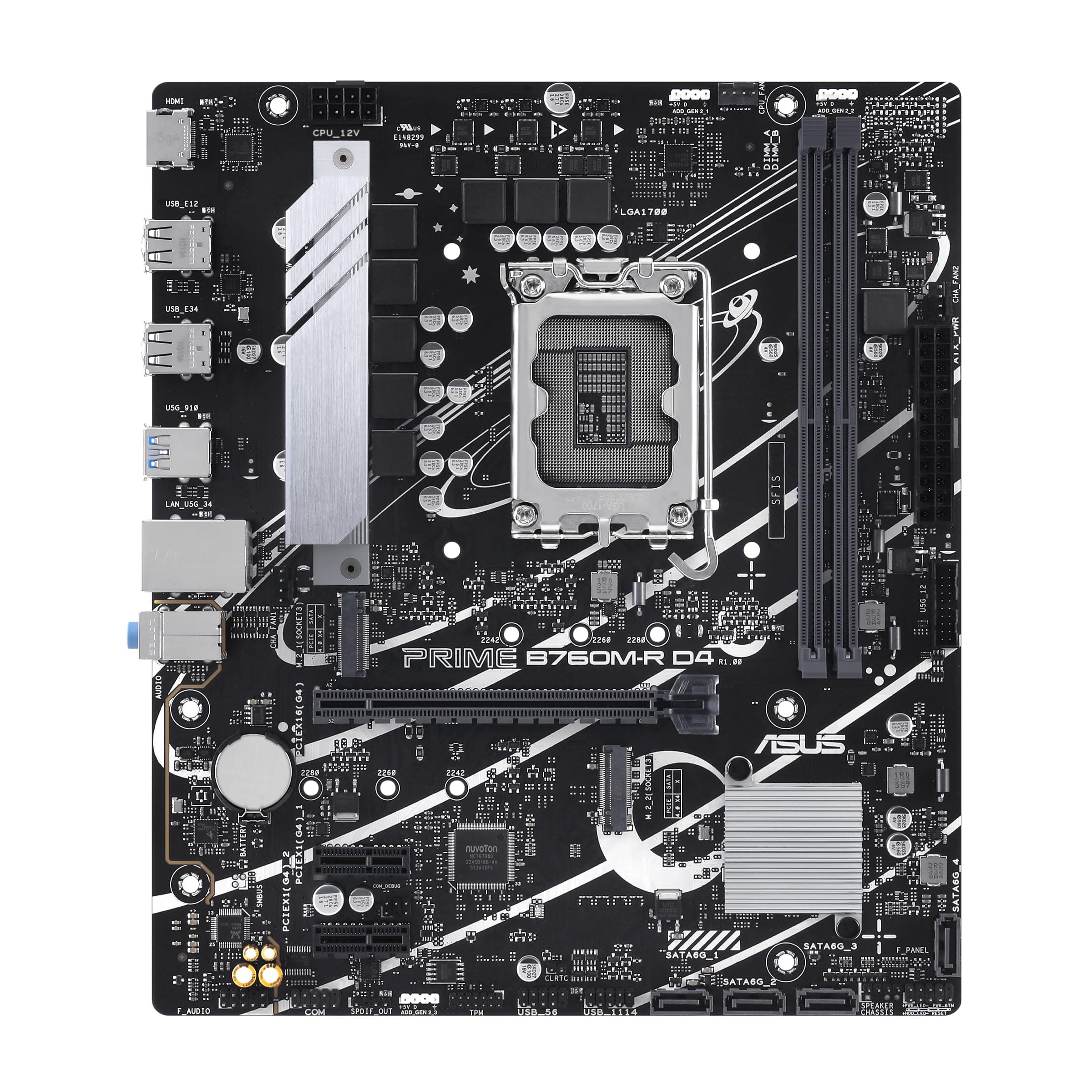 ASUS PRIME B760M-R D4 Scheda Madre Intel mATX (LGA 1700), PCIe 4.0, 2 M.2 slot, DDR4, Ethernet Realtek 2.5Gb, HDMITM, SATA 6 Gbps, Porta USB Frontale 5Gbps, Aura Sync, Nero