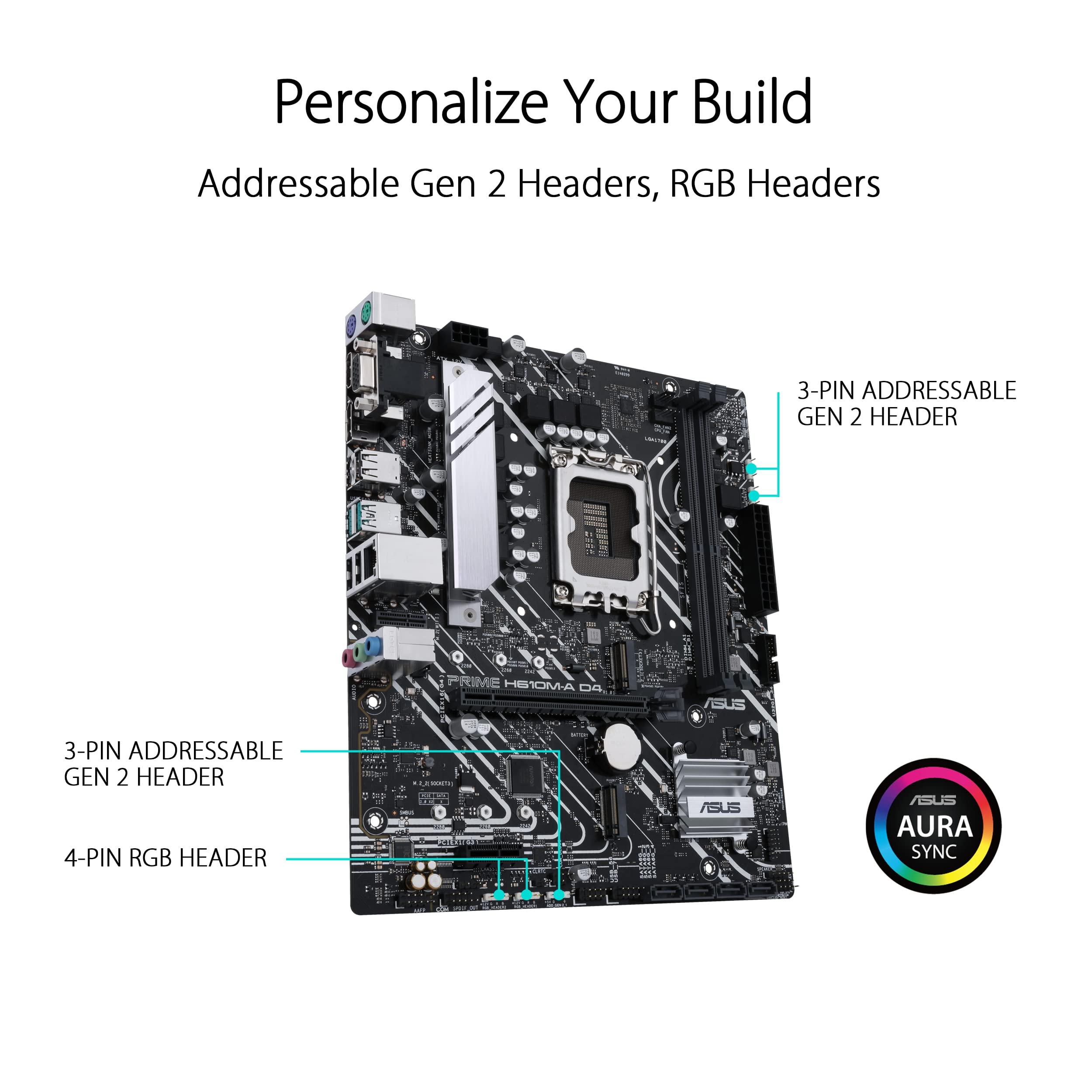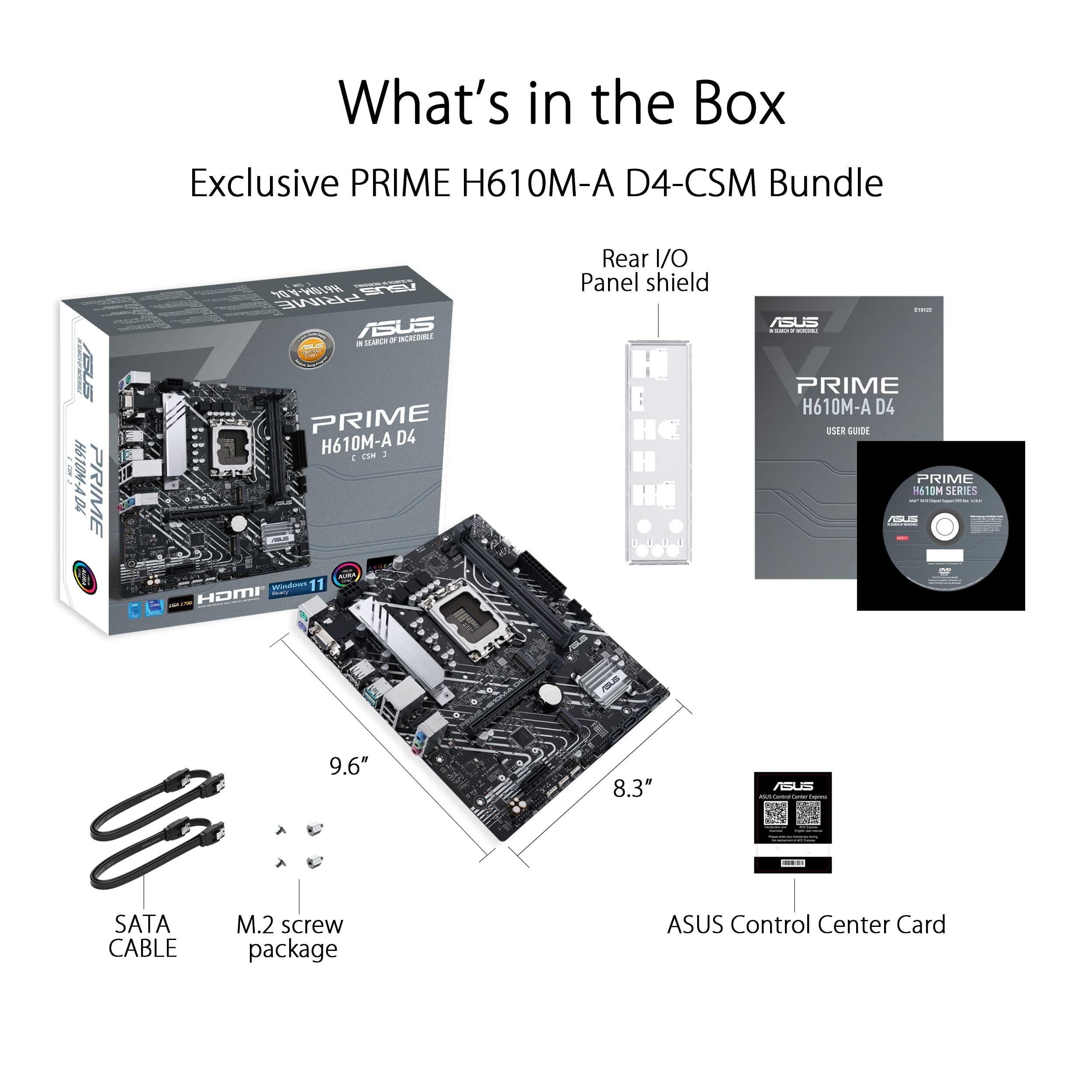 ASUS PRIME H610M-A D4-CSM Scheda Madre mATX, Intel H610, LGA1700, DDR4, PCI 4.0, Intel 1Gb Ethernet, Realtek 7.1 Surround, 2xM.2, 4xSATA 6GB/s, USB 3.2 Gen 2, Armoury Crate, Nero