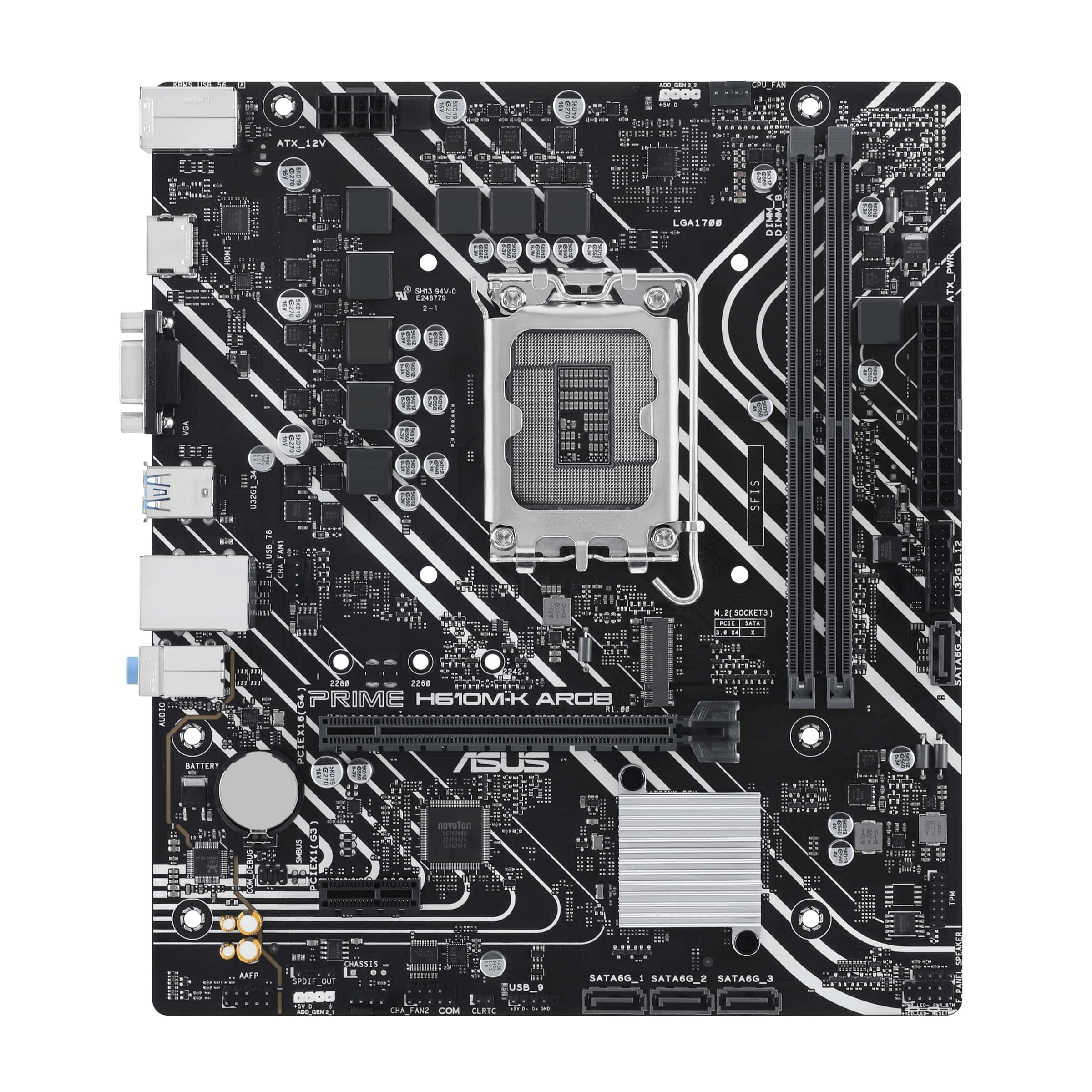 ASUS PRIME H610M-K ARGB Scheda madre mATX Intel H610 (LGA 1700), DDR5, PCIe 4.0, slot M.2, Realtek 1 Gb Ethernet, HDMI, VGA, USB 3.2 Gen 1, SATA 6 Gbps, Header indirizzabili Gen 2, Aura Sync