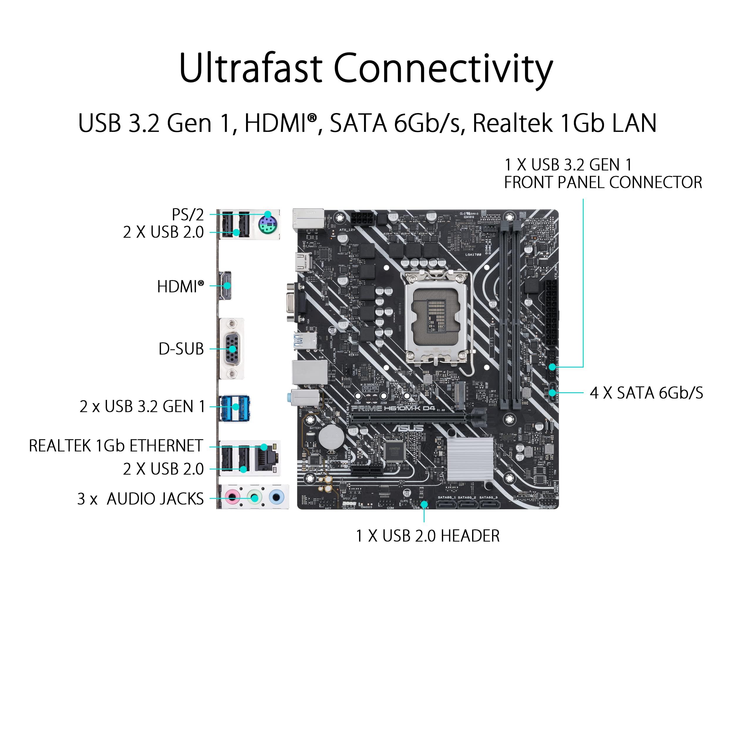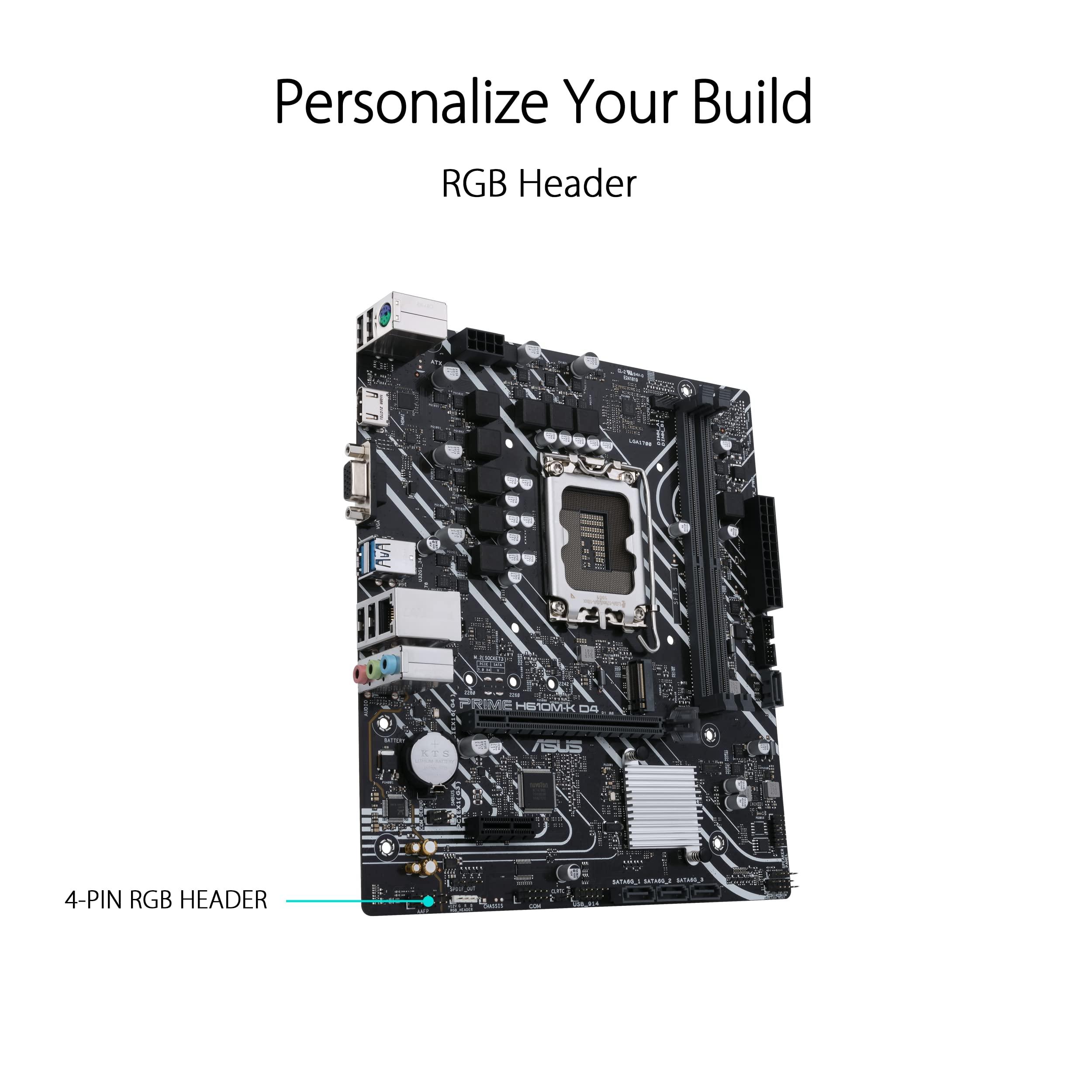 ASUS PRIME H610M-K D4 Scheda Madre MATX, Intel H610, LGA1700, DDR4, PCI 4.0, Realtek 1Gb Ethernet, Realtek 7.1 Surround, 1xM.2, 4xSATA 6GB/s, USB 3.2 Gen 1, Armoury Crate, Nero