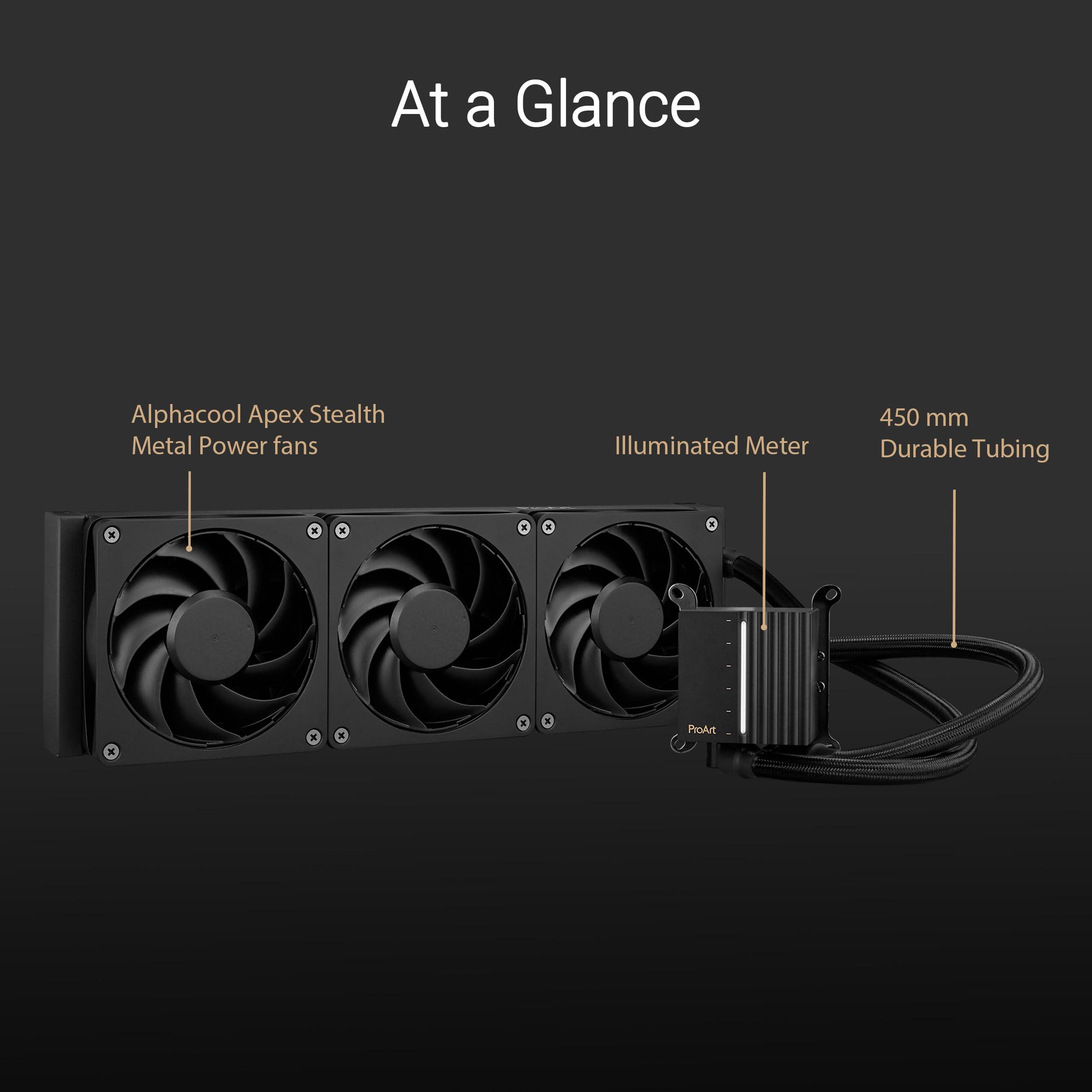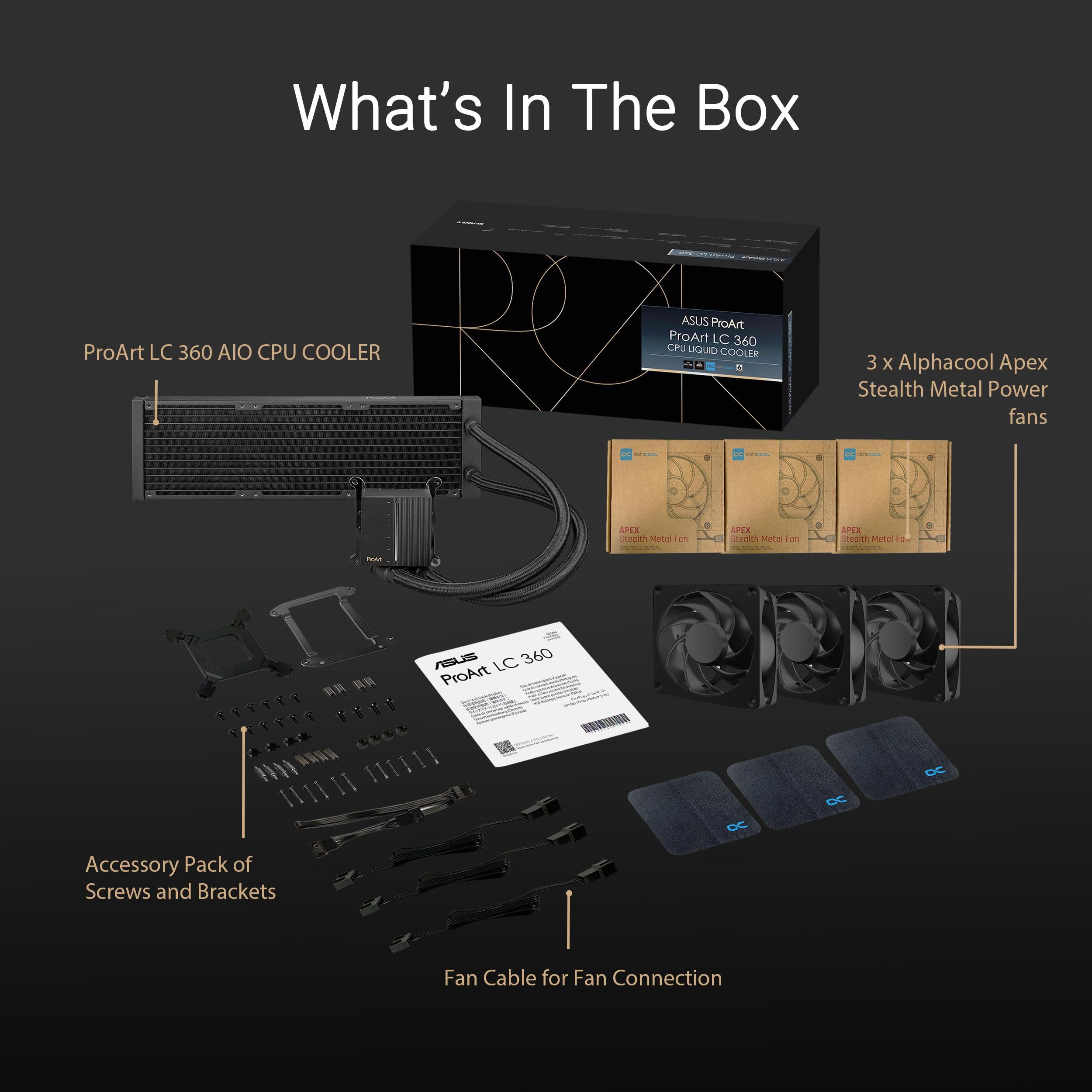 ASUS ProArt LC 360, Dissipatore a Liquido All-In-One con Pompa a Tre fasi ad Alta Prestazione, Tre Ventole Alphacool Apex Stealth Metal Power a Basso Rumore, Nero
