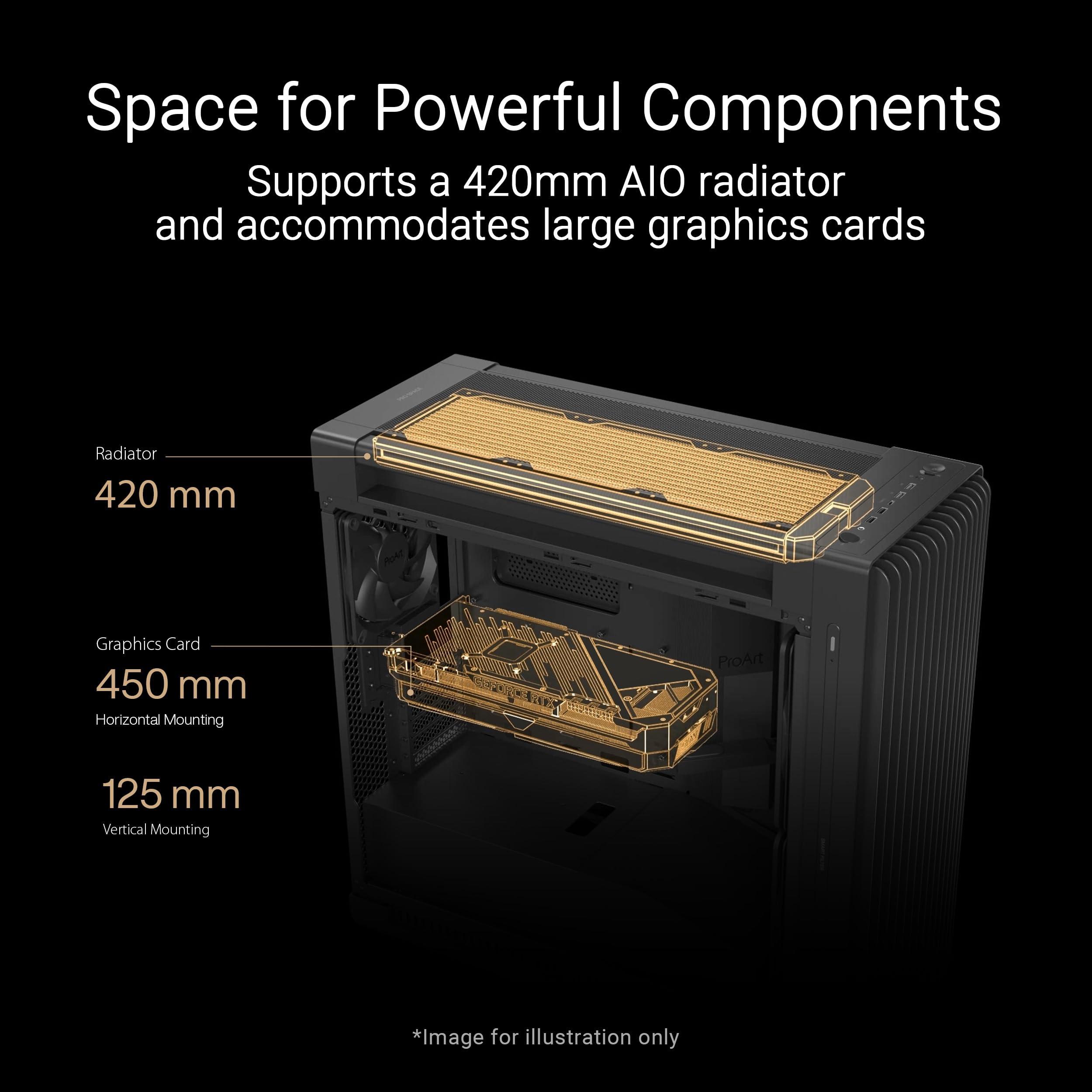 - Estetica elegante: case minimalista tipico del design ProArt, realizzato in legno di frassino e disponibile in due versioni, con pannello laterale in metallo o in vetro temperato, per un maggior fascino estetico