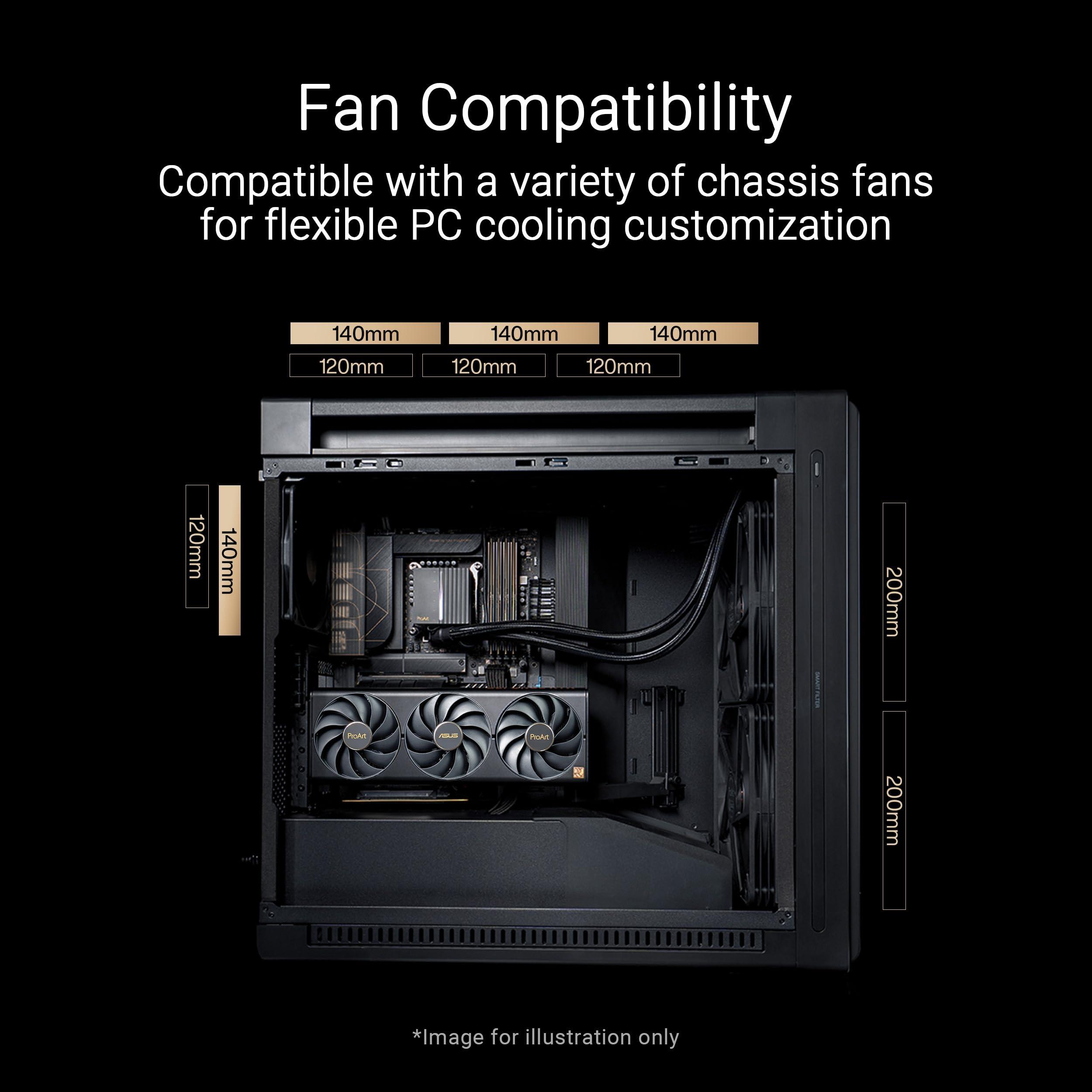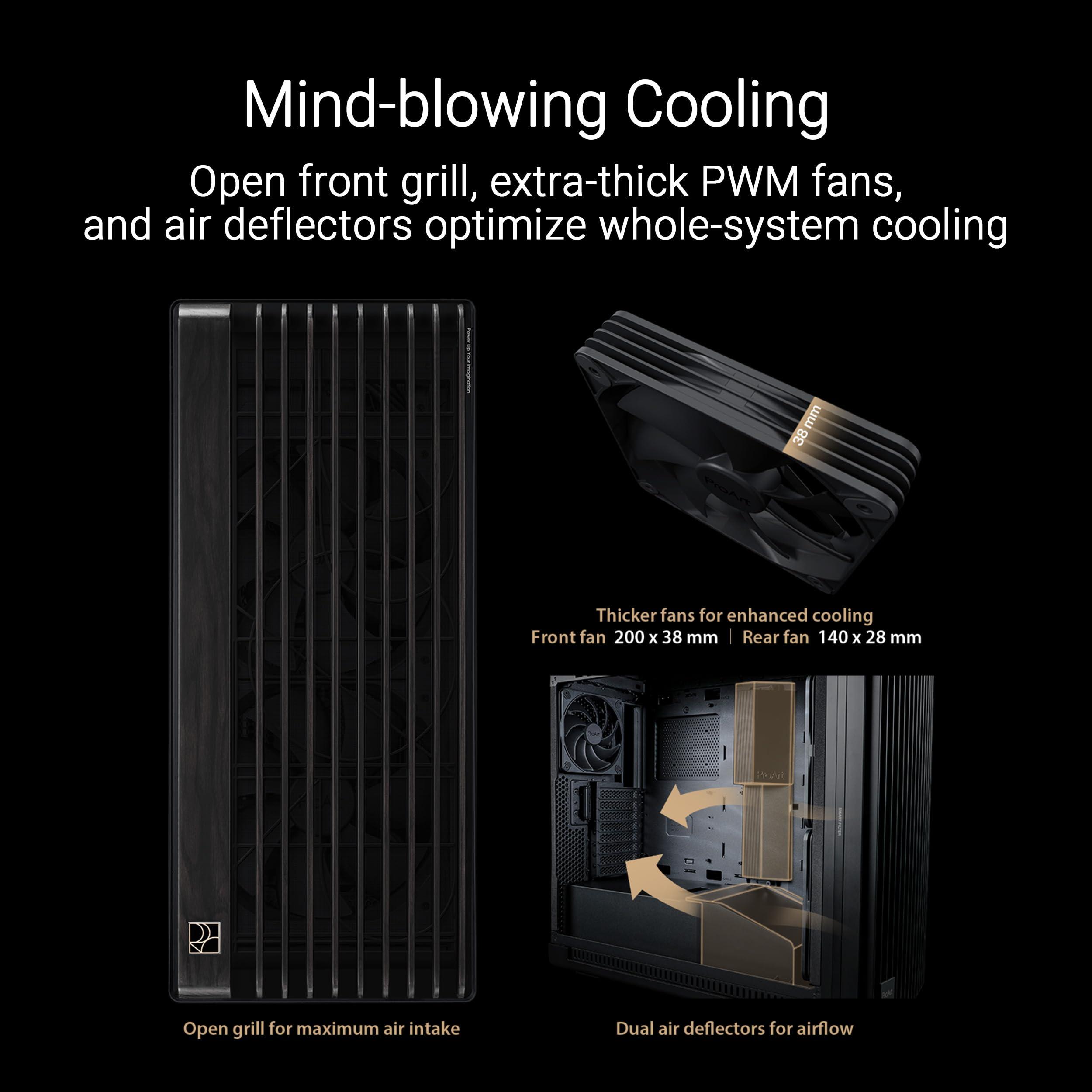 ASUS PROART PA602 Wood TG PWM BLACK, Case Gaming E-ATX in Vetro Temperato, Supporto per Dissipatore da 420 mm, Ventole da 140 mm e 200 mm, Rilevatore di Polvere IR, Presa d’aria Laterale, Nero