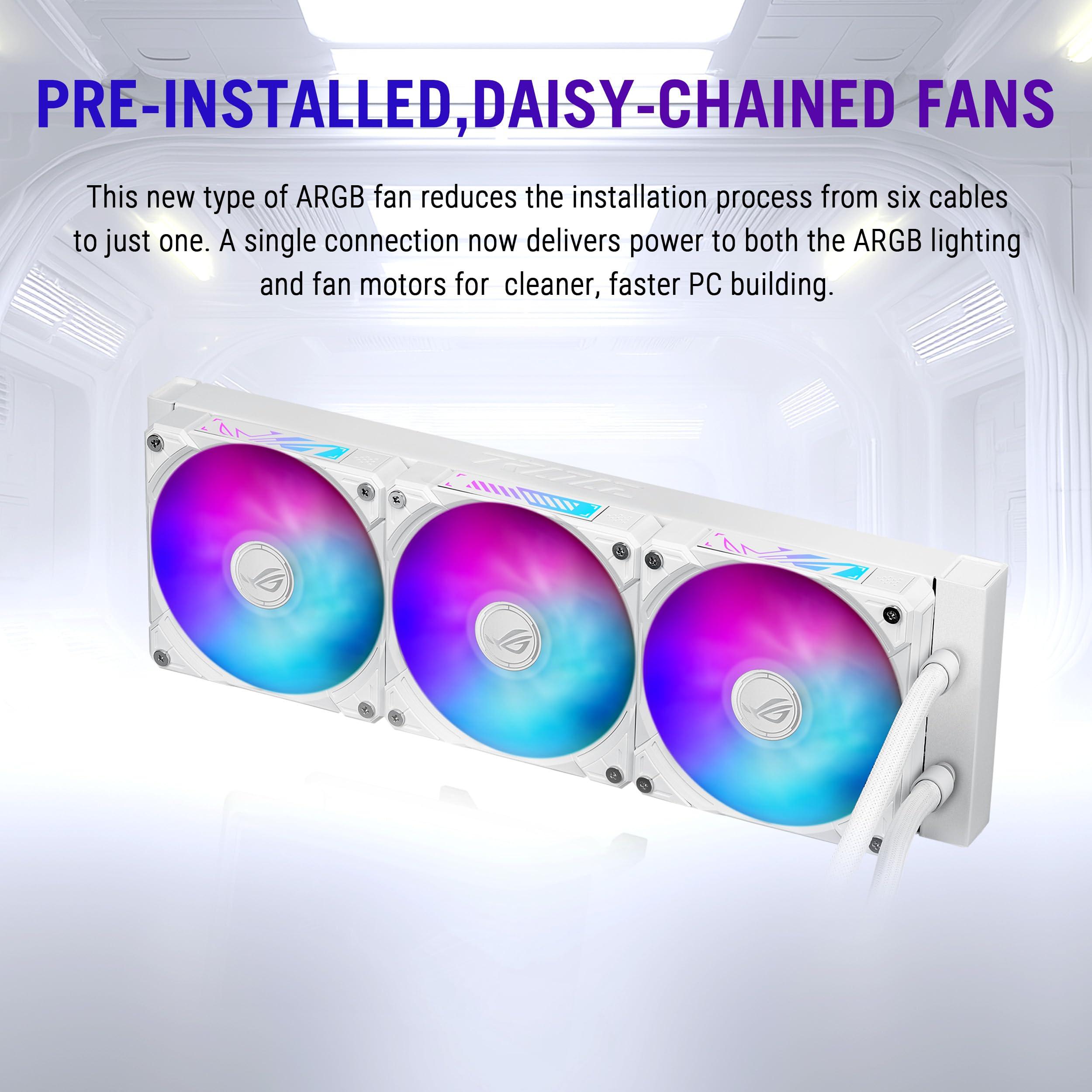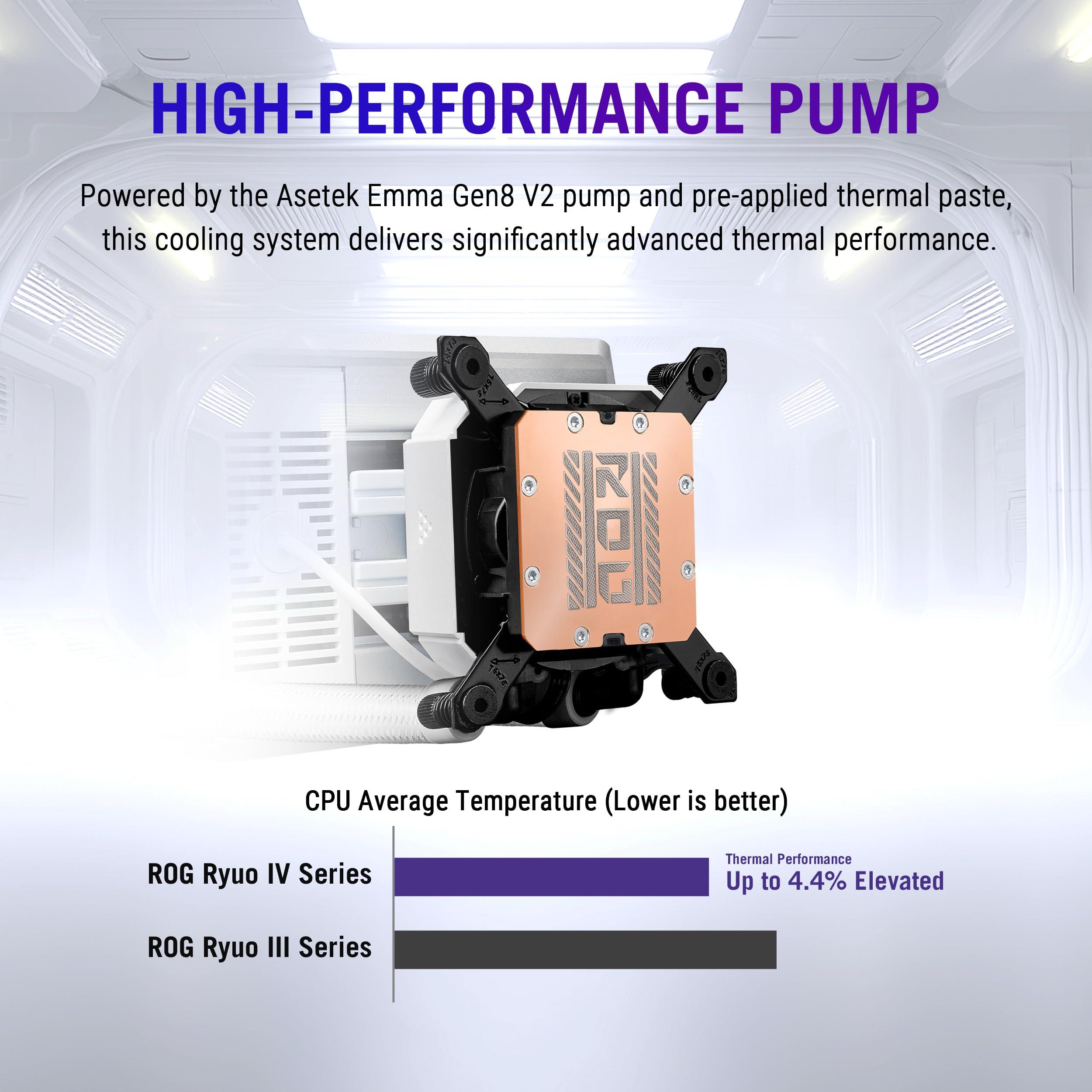 - ROG Ryuo IV 360 ARGB White Edition è dotato della potente pompa Asetek Emma Gen8 V2 per garantire che la CPU mantenga temperature di esercizio ottimali anche in presenza di carichi di lavoro elevati