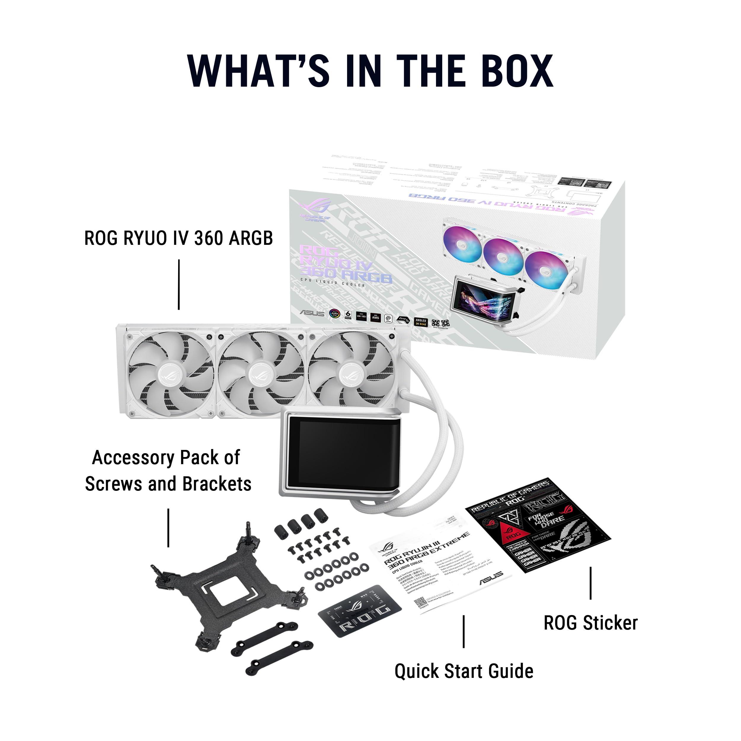 ASUS ROG RYUO IV 360 ARGB WHT, Dissipatore a Liquido con Schermo Curvo 2K AMOLED da 6,67" per Effetti 3D, Tubi da 400mm, Ventole ARGB, Compatibile con Intel LGA 1851 e 1700 e AMD AM5 e AM4, Bianco
