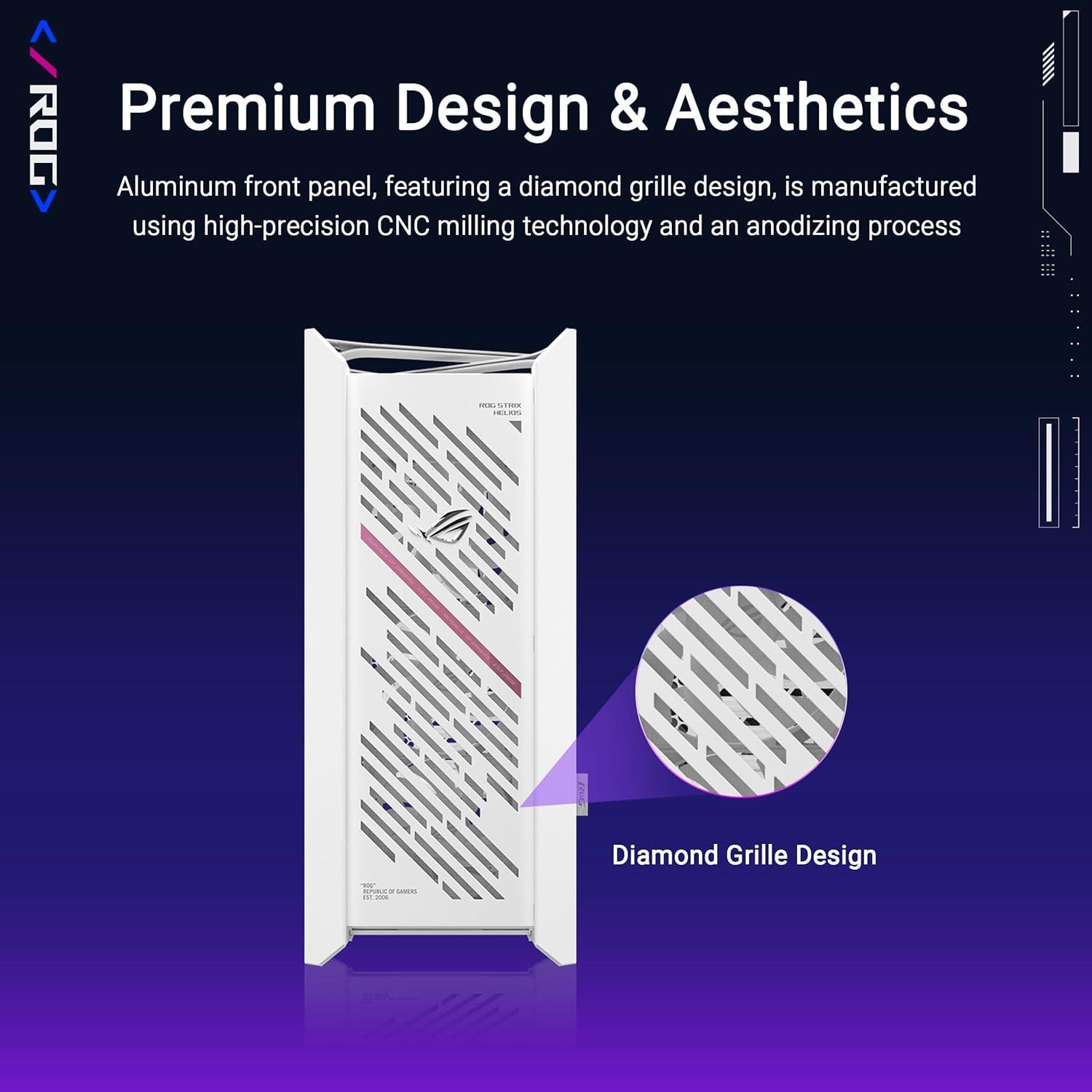 - Design premium: ROG Strix Helios II è progettato per mostrare cosa c'è al suo interno, grazie ai pannelli laterali in vetro temperato; inoltre, il pannello frontale in alluminio con design a griglia diamantata e filtro con struttura 3D assicurano un raffreddamento efficace