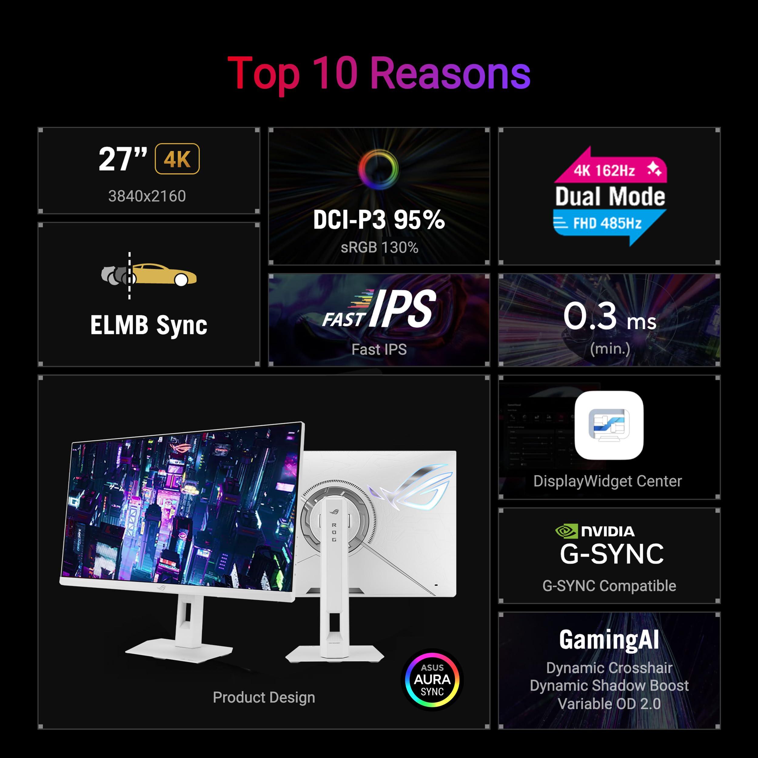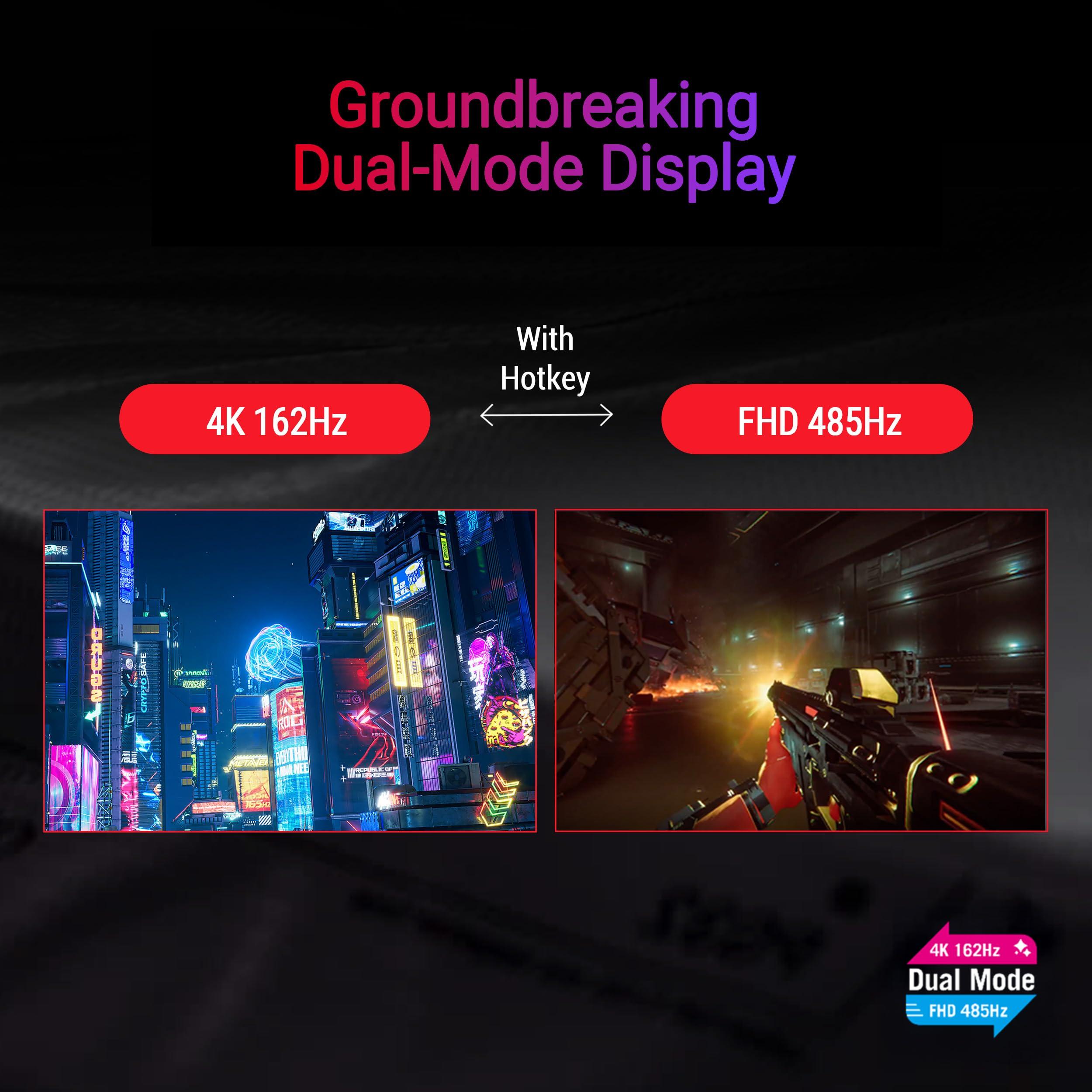 - Monitor da gioco da 27 pollici (3840 x 2160) con doppia modalità, 4K e frequenza di 162Hz, o FHD e frequenza di 485Hz, progettato per giocatori professionisti e gameplay coinvolgente