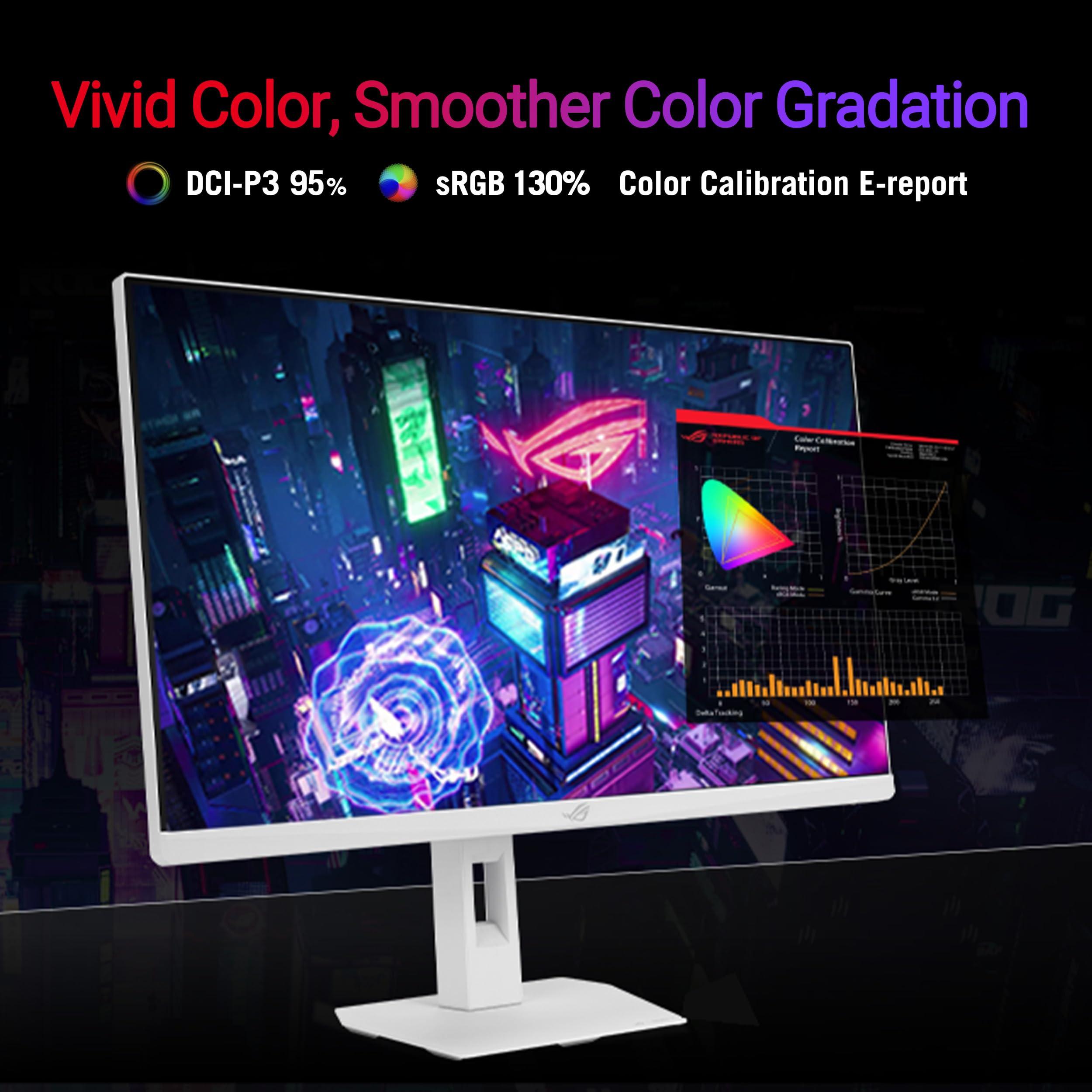 - Grazie al 95% di spazio colore DCI-P3 e all'avanzata tecnologia di tracciamento in scala di grigi ASUS si potranno avere gradazioni di colore più omogenee, e quindi una maggiore uniformità