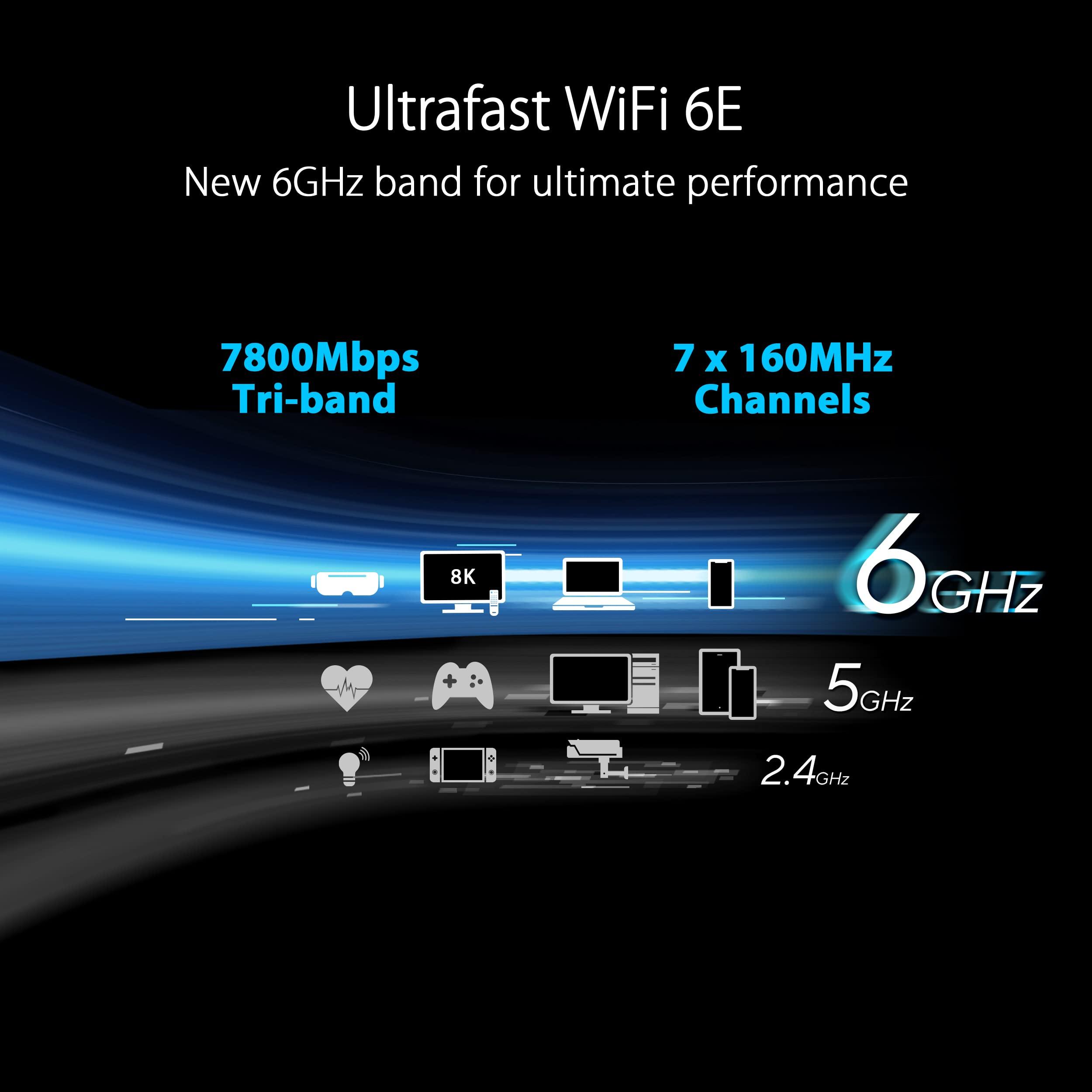 - Tecnologia WiFi 6E ultraveloce: la nuova banda da 6 GHz aumenta notevolmente la capacità della rete, offrendo prestazioni WiFi più elevate e una connettività più stabile con velocità fino a 7800 Mbps