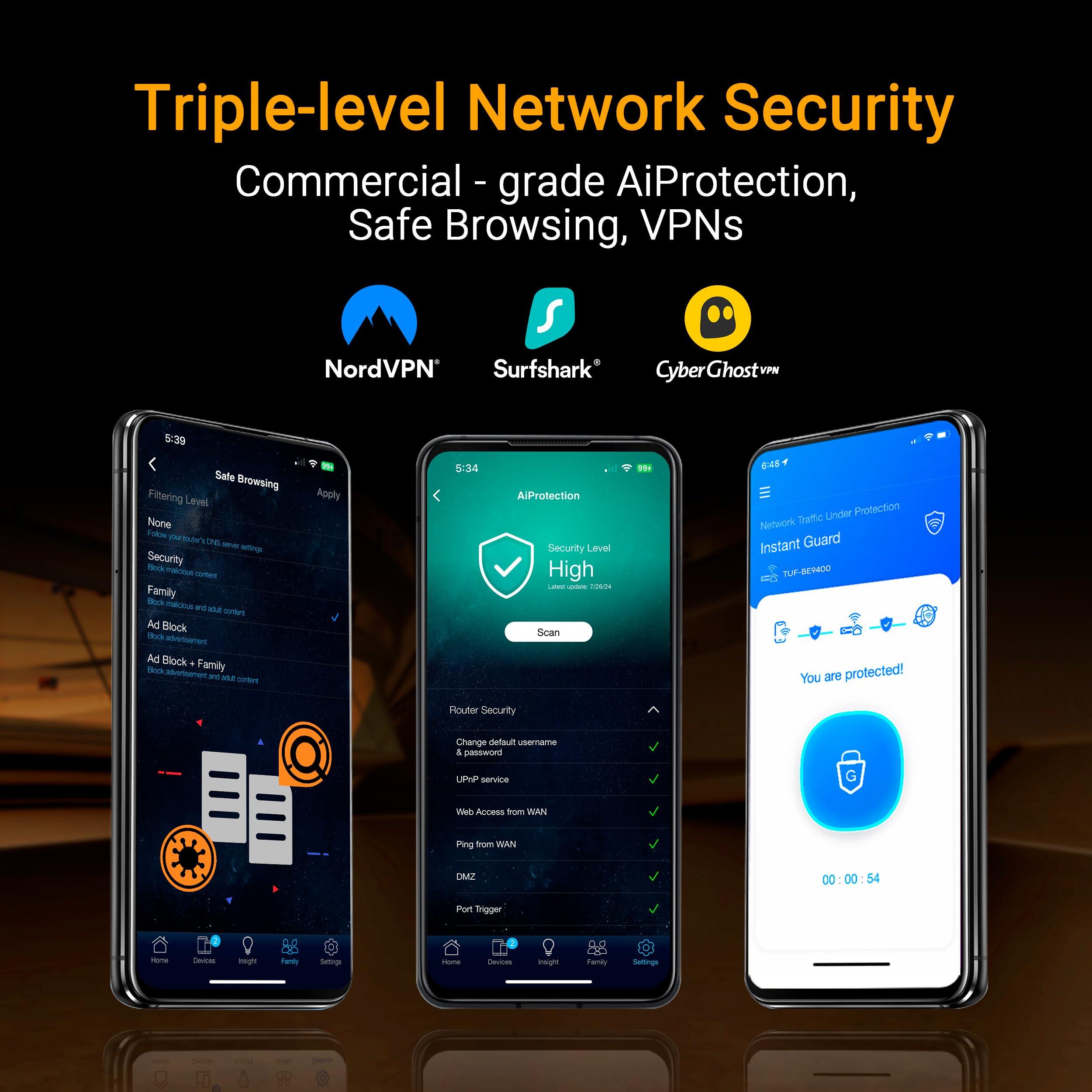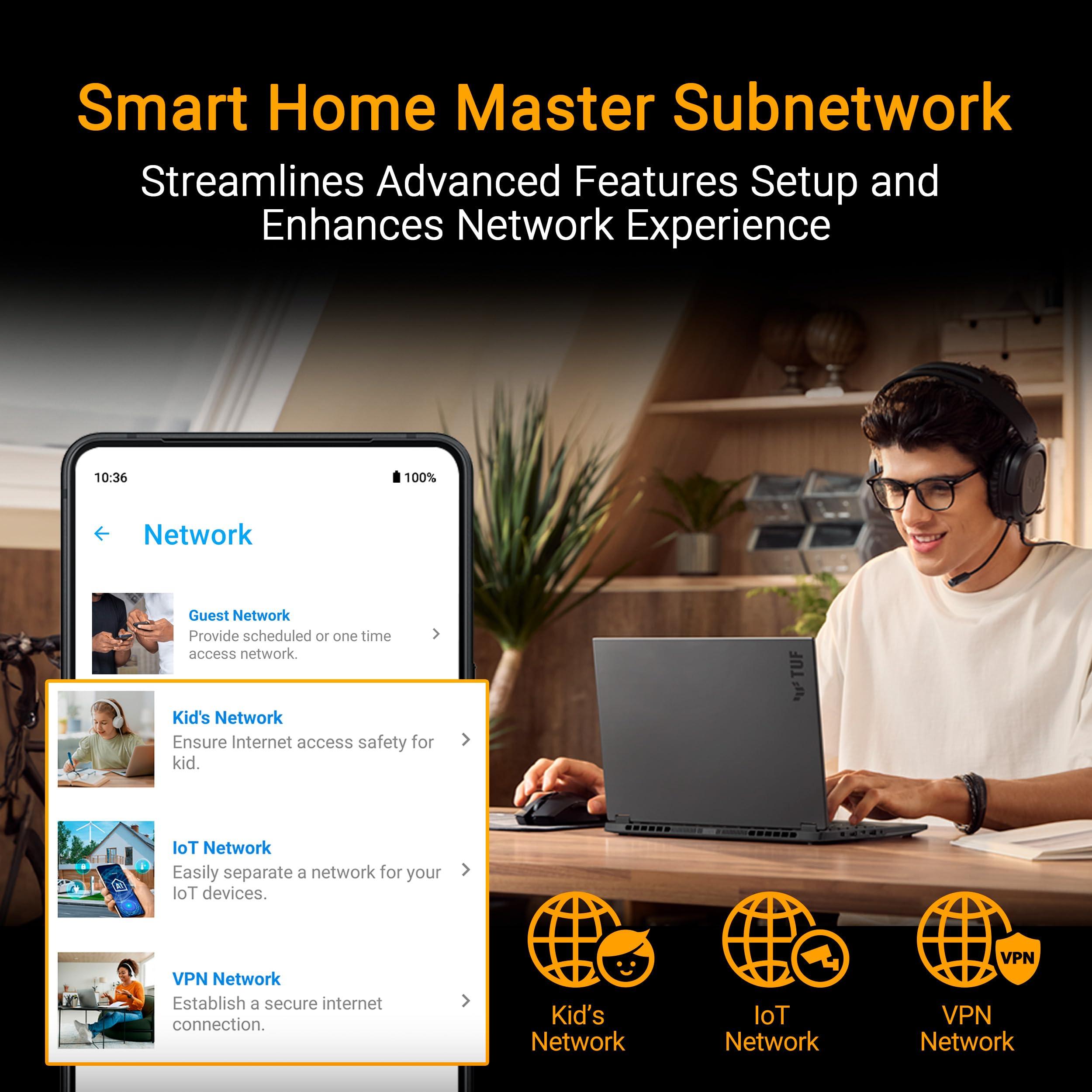 - Sicurezza di rete avanzata a triplo livello, grazie all'AiProtection e alle VPN preinstallate; è inoltre molto semplice la configurazione dei dispositivi IoT e delle sottoreti VPN, grazie alle connessioni istantanee con Smart Home Master