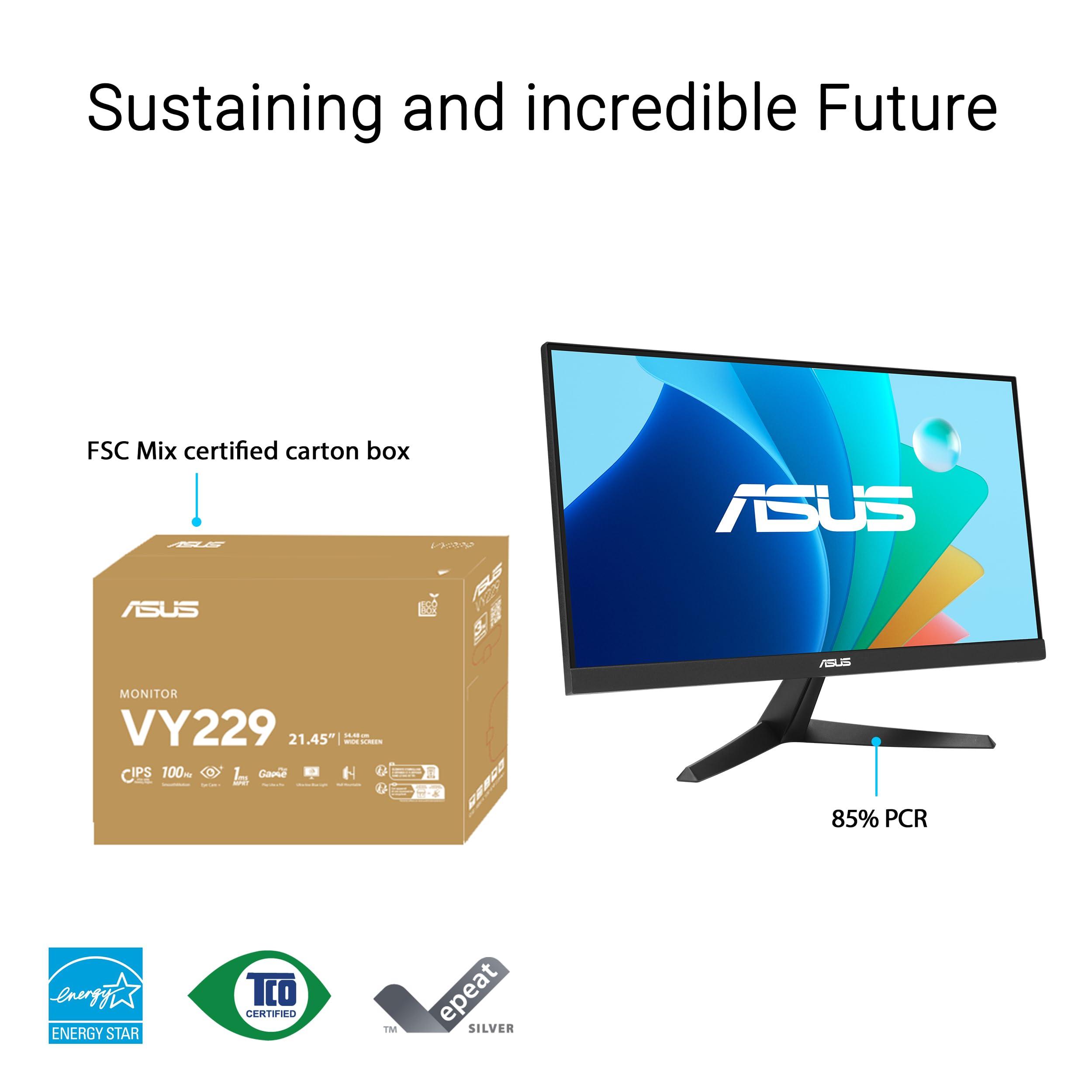 ASUS VY229HF Monitor Eye Care da 22” pollici (21.45), FHD (1920x1080), IPS, 100Hz, IPS, SmoothMotion, 1ms (MPRT), Adaptive Sync, Tecnologia Eye Care Plus, Filtro Luce Blu, Anti-sfarfallio, Nero