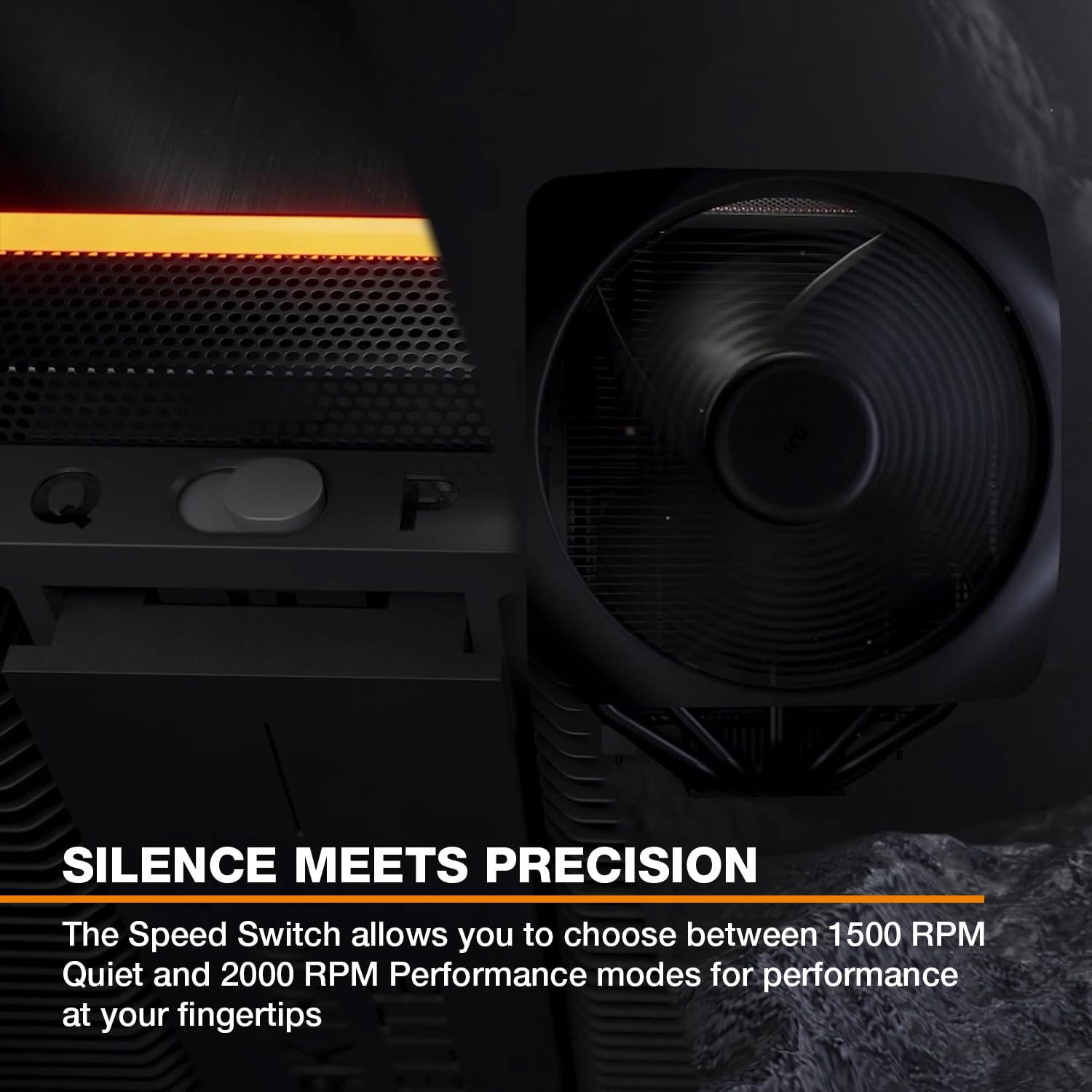 - Un selettore di velocità vi permetterà di scegliere tra Quiet Mode e Performance Mode, andando a modificare la velocità massima delle ventole e la curva PWM. Il Quiet Mode limita la velocità massima della ventola a 1500 RPM ed è la scelta ideale per sistemi orientati alla silenziosità. Il Performance Mode permette invece alle ventole Silent Wings di ruotare ad una velocità massima di 2000 RPM e permette al Dark Rock Elite di sprigionare le prestazioni massime.