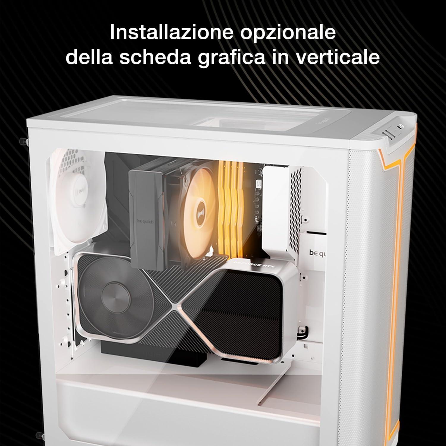 - Perché non provare qualcosa di nuovo con la vostra GPU? Gli slot PCIe del Pure Base 501 DX White possono essere ruotati di 90° per il montaggio verticale di voluminose schede grafiche di fascia alta. Le dimensioni sono perfette per il be quiet! Riser Cable venduto separatamente, la cui base in spugna fornisce un eccellente