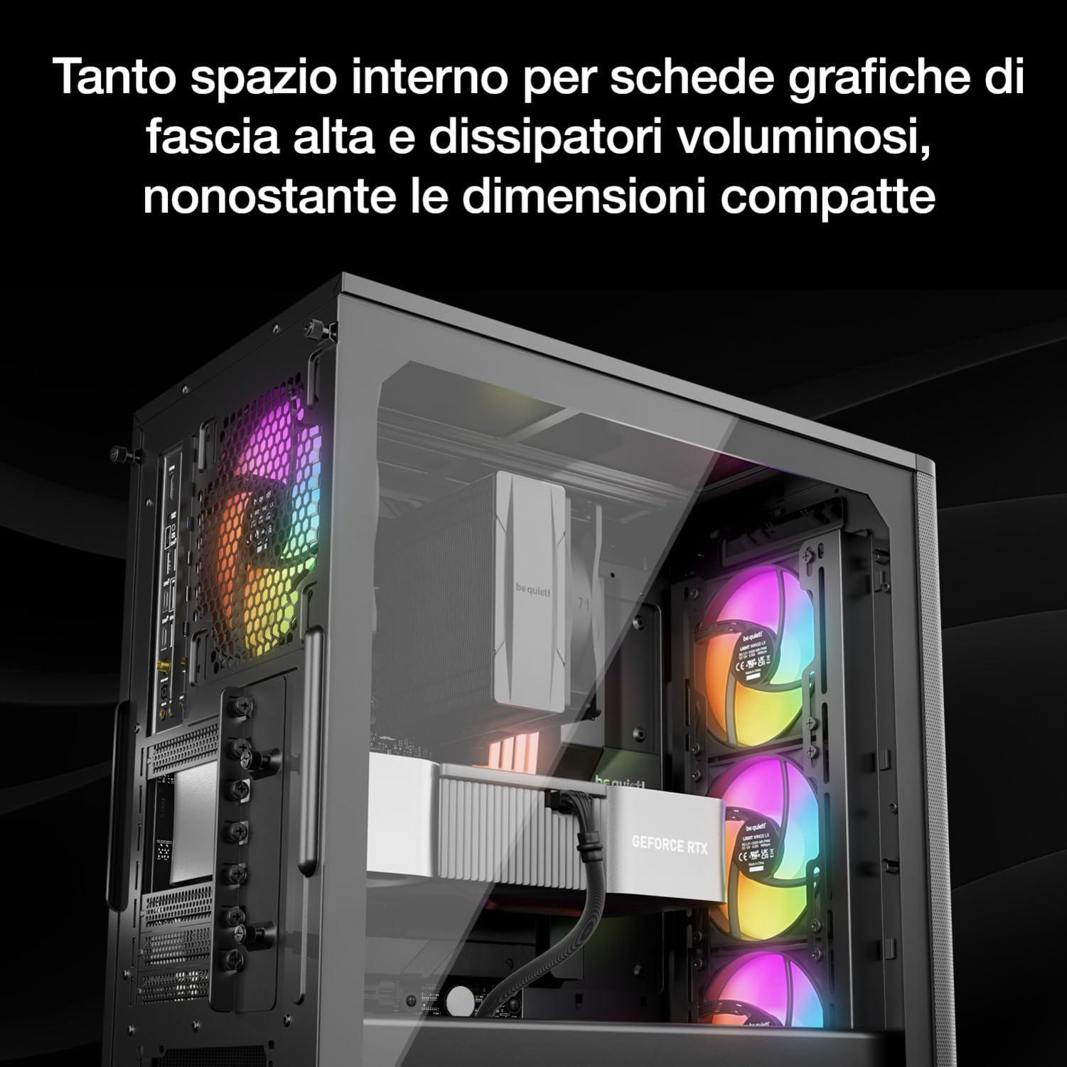 - Nonostante le sue dimensioni compatte, Despite its compact dimensions, Pure Base 501 LX Black offre abbastanza spazio per schede grafiche di fascia alta e dissipatori ad aria voluminosi. Tre ventole o un radiatore fino a 360mm possono essere installati facilmente nella parte anteriore, e la parte superiore fornisce abbastanza spazio per l'installazione di ventole o di un radiatore fino a 240mm.