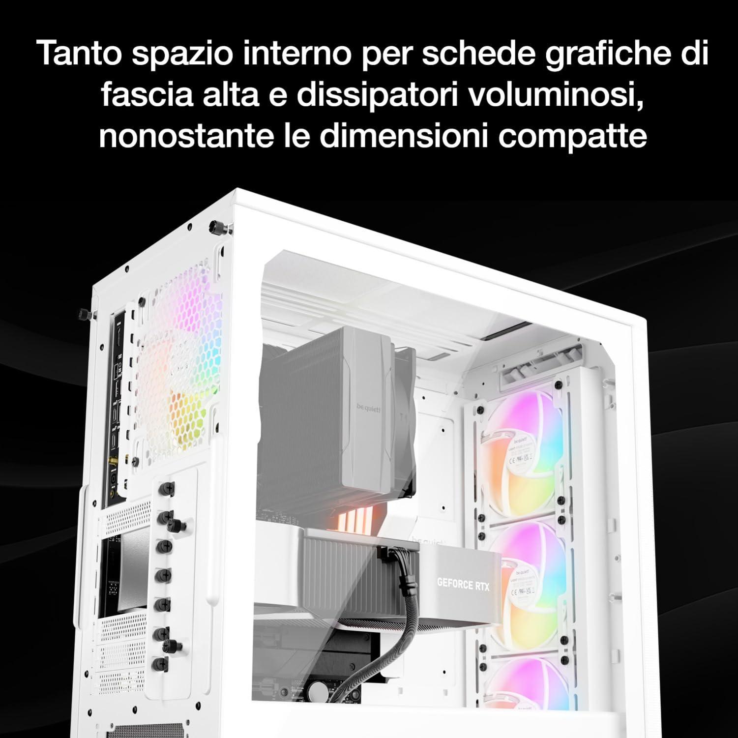 - Nonostante le sue dimensioni compatte, Despite its compact dimensions, Pure Base 501 LX White offre abbastanza spazio per schede grafiche di fascia alta e dissipatori ad aria voluminosi. Tre ventole o un radiatore fino a 360mm possono essere installati facilmente nella parte anteriore, e la parte superiore fornisce abbastanza spazio per l'installazione di ventole o di un radiatore fino a 240mm.