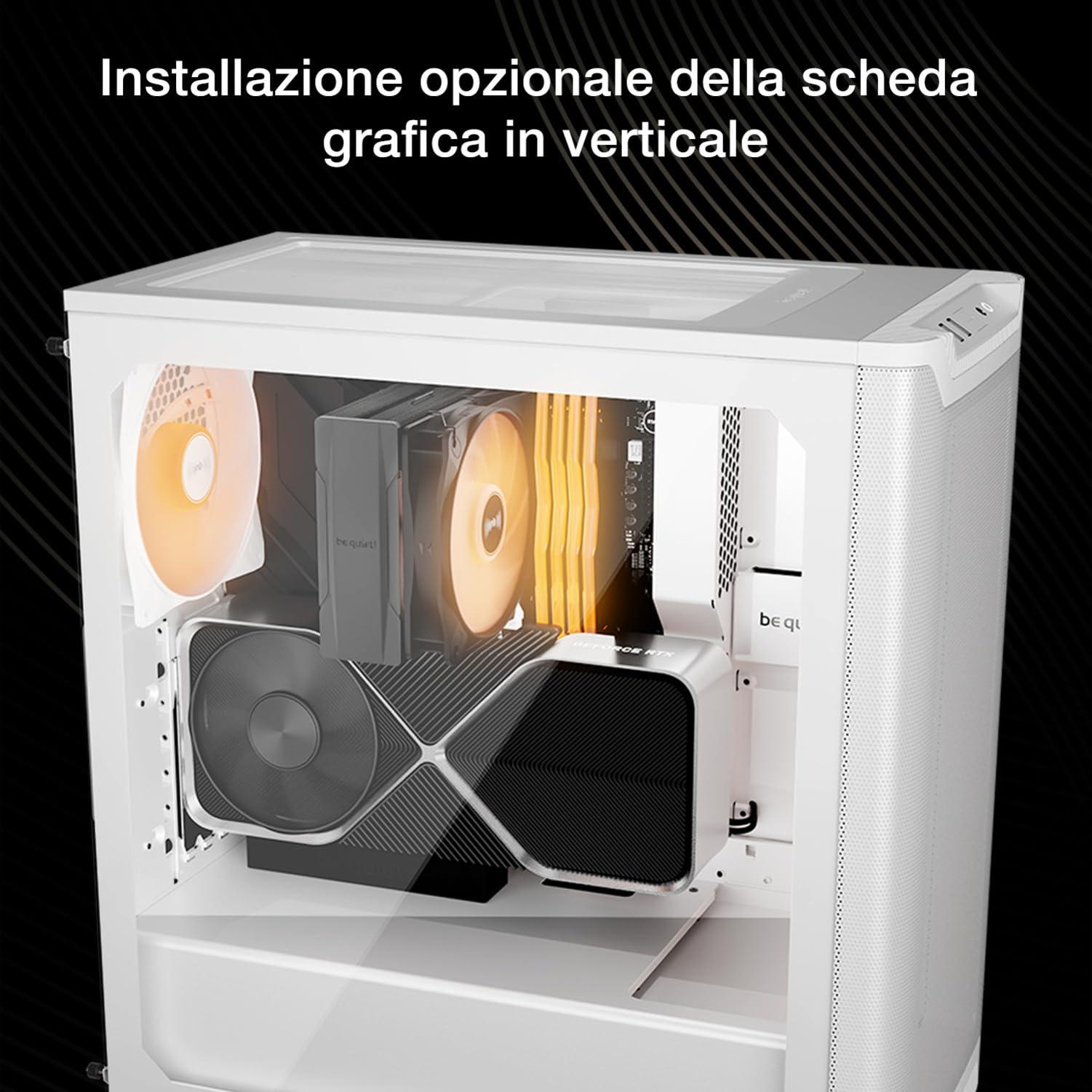 - Perché non provare qualcosa di nuovo con la vostra GPU? Gli slot PCIe del Pure Base 501 LX White possono essere ruotati di 90° per il montaggio verticale di voluminose schede grafiche di fascia alta. Le dimensioni sono perfette per il be quiet! Riser Cable venduto separatamente, la cui base in spugna fornisce un eccellente supporto anti-flessione per le schede grafiche orientate verticalmente.