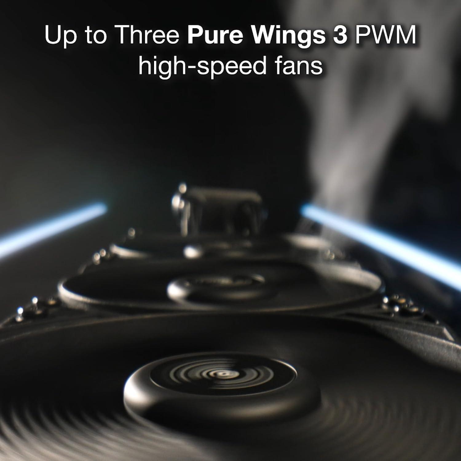 - Tre ventole Pure Wings 3: 3 ventole PWM da 120mm ad alta pressione statica, con rumore massimo di 34,9 dB(A), ideali per radiatori ad alte prestazioni.