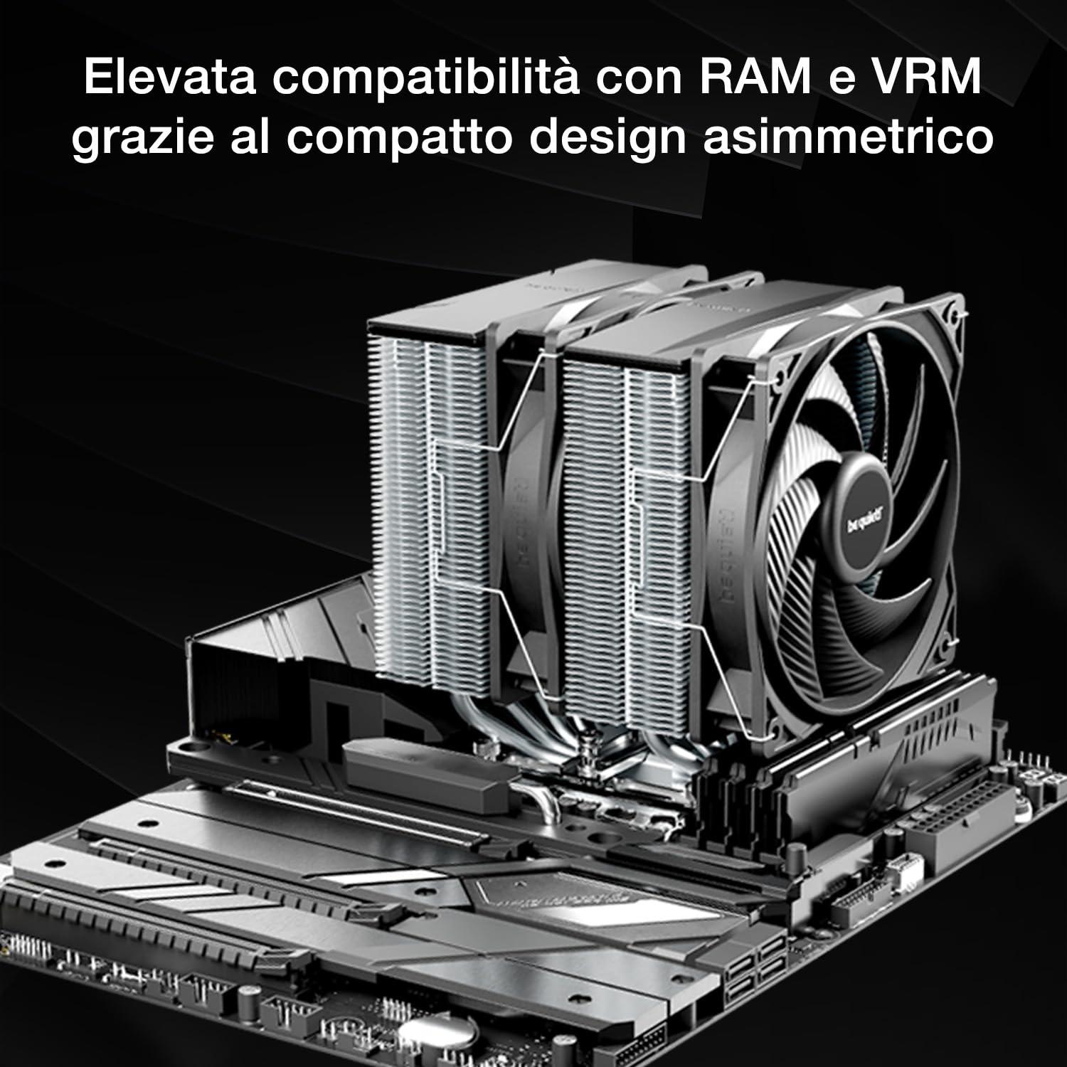 - Nonostante sia un dissipatore a doppia torre, il compatto design sfalsato del Pure Rock Pro 3 Black aumenta notevolmente la compatibilità con le RAM e i dissipatori VRM. L'altezza della ventola anteriore può inoltre essere regolata, se necessario.