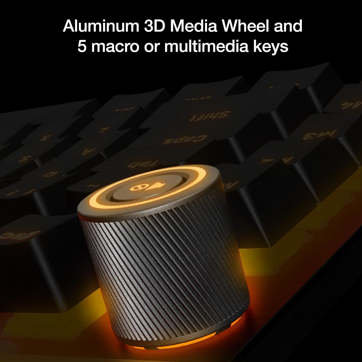 - Prendi il controllo della tua musica e dei tuoi video con una rotellina multimediale 3D programmabile in alluminio. Di default, è possibile regolare il volume e la modalità muto. Un totale di 5 tasti macro meccanici può eseguire ulteriori funzioni multimediali o azioni specifiche del gioco.