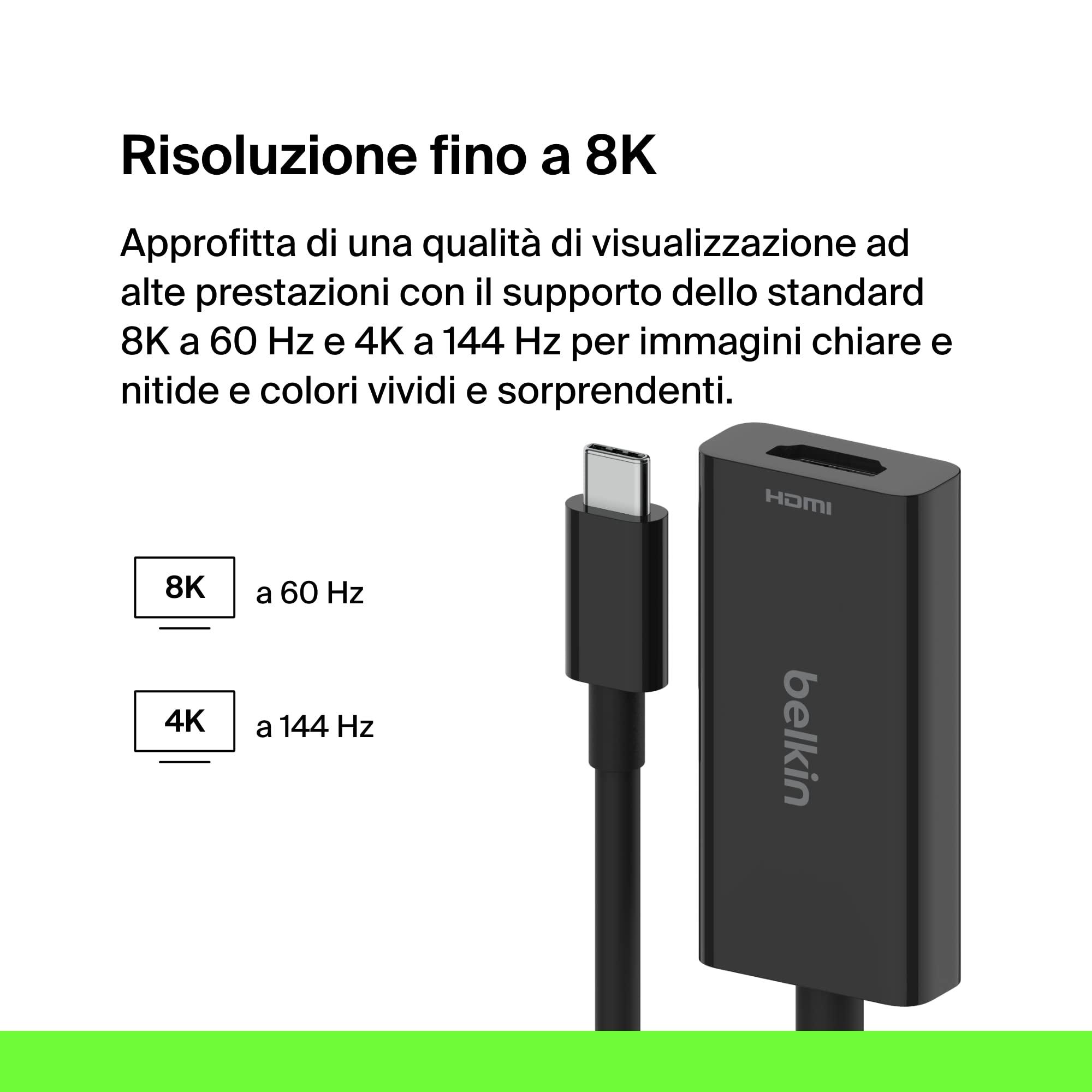 Belkin Adattatore USB-C-HDMI 2.1 con cavo (11 cm), supporto 8K a 60 Hz/4K a 144 Hz, HDR, HBR3, DSC, HDCP 2.2, certificato USB-IF/Works with Chromebook, per MacBook, iPad Pro e altri dispositivi USB-C
