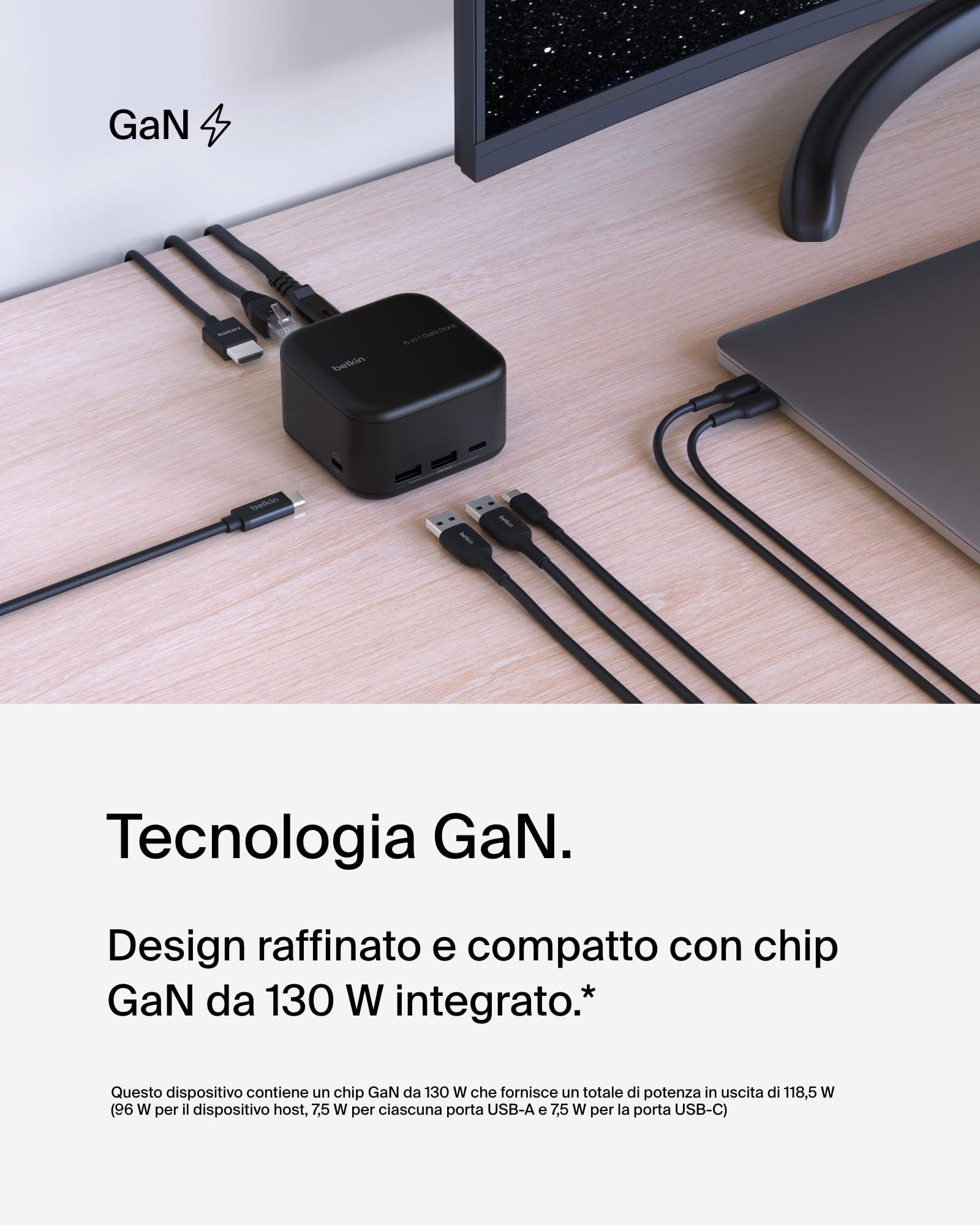 - POTENZA E RICARICA GAN: la tecnologia GaN offre 130 W per il dispositivo host e 96 W per le periferiche. Anche se le dimensioni dei prodotti GaN sono ridotti, permettono di ricaricare in modo più sicuro e veloce rispetto agli altri caricabatterie.