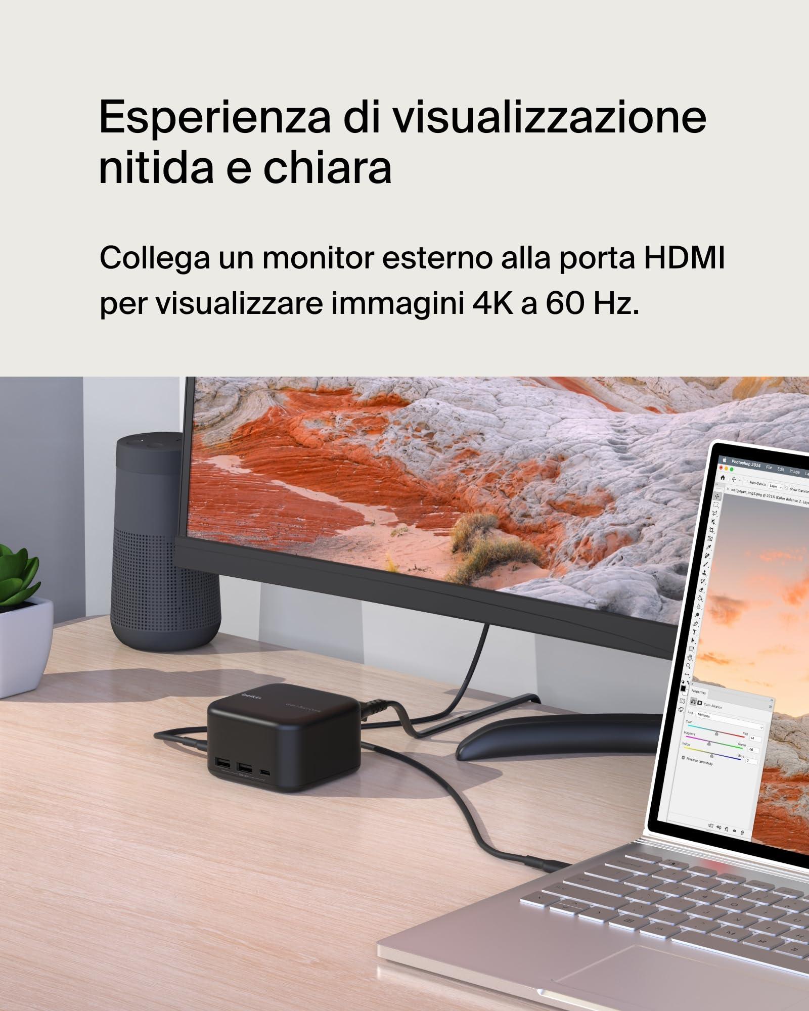 - DA 1 A 6 PORTE: compatto e multifunzionale, il dock Belkin consente di accedere alle porte eliminate sui laptop più recenti e di aumentare la produttività con le porte USB-C, USB-A, HDMI e GbE aggiuntive, disponibili tramite una singola connessione.