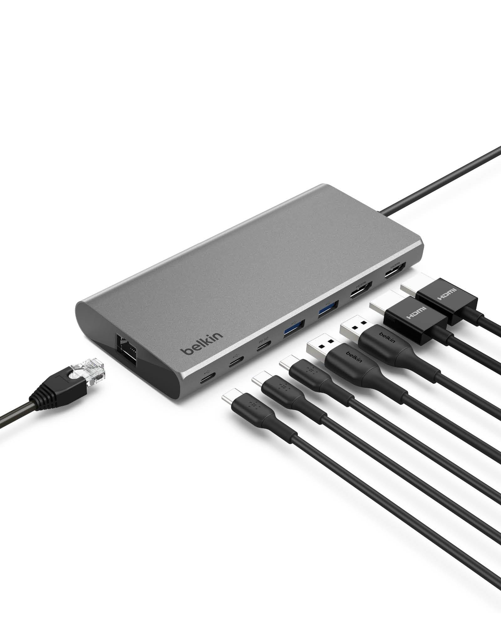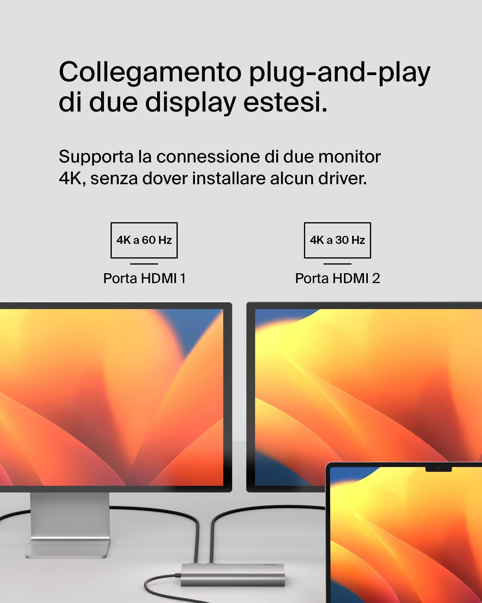 Belkin Connect Hub universale 8 in 1 USB-C per 2 display Core con tecnologia Silicon Motion, compatibile con Mac, Windows e Chromebook, 100 W PD, velocità di trasferimento di 10 Gbps, 1 GbE, Argento