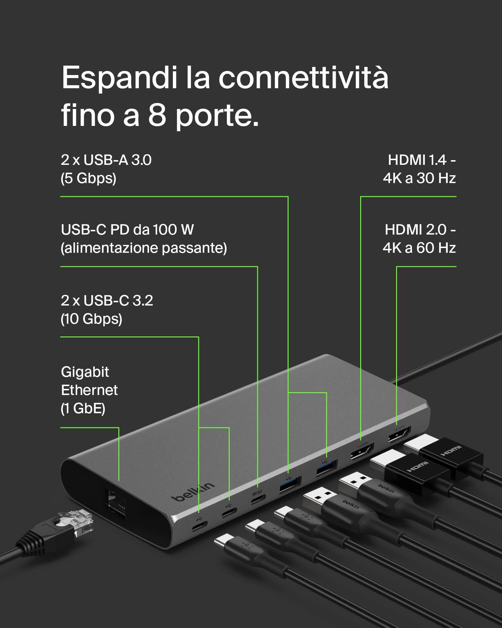 - HUB USBC 8 in 1: la docking station USBC include 8 porte (2 USB-C, 2 USB-A, 2 HDMI, 1 Ethernet e 1 USB-C 100 W) per consentirti di approfittare al massimo della porta USB-C del tuo laptop.