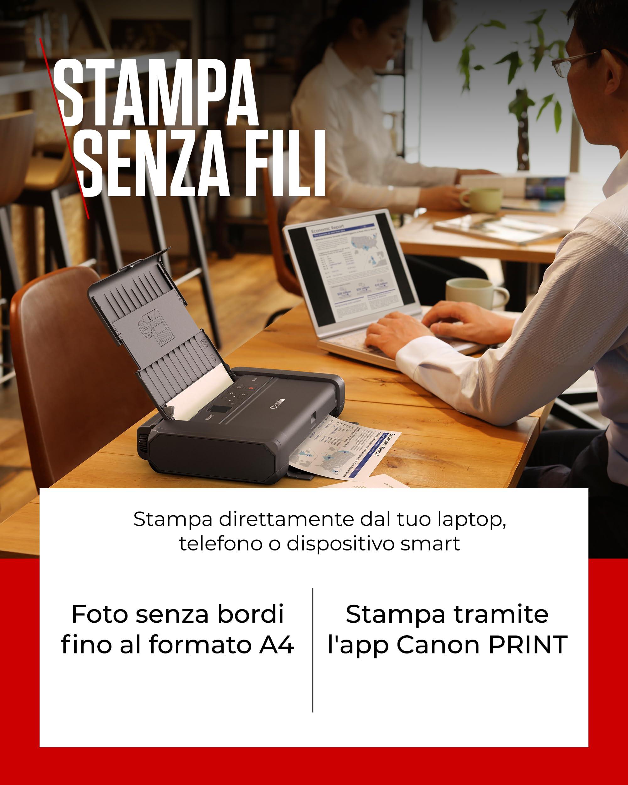 - STAMPANTE WIRELESS: Stampa in modalità wireless da laptop, tablet o smartphone. Realizza documenti di alta qualità e foto senza bordi fino al formato A4 tramite l’app Canon PRINT o cavo USB Type-C