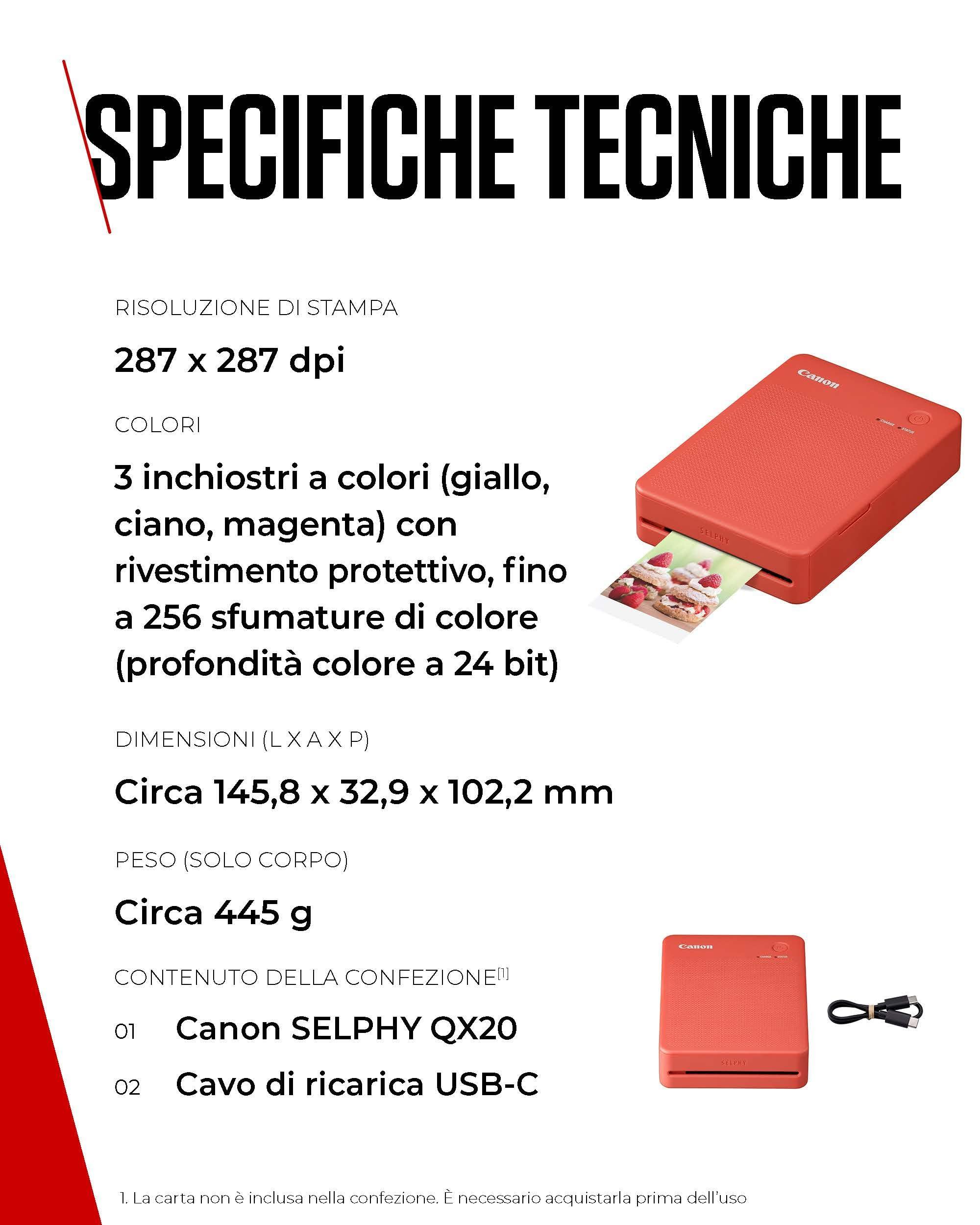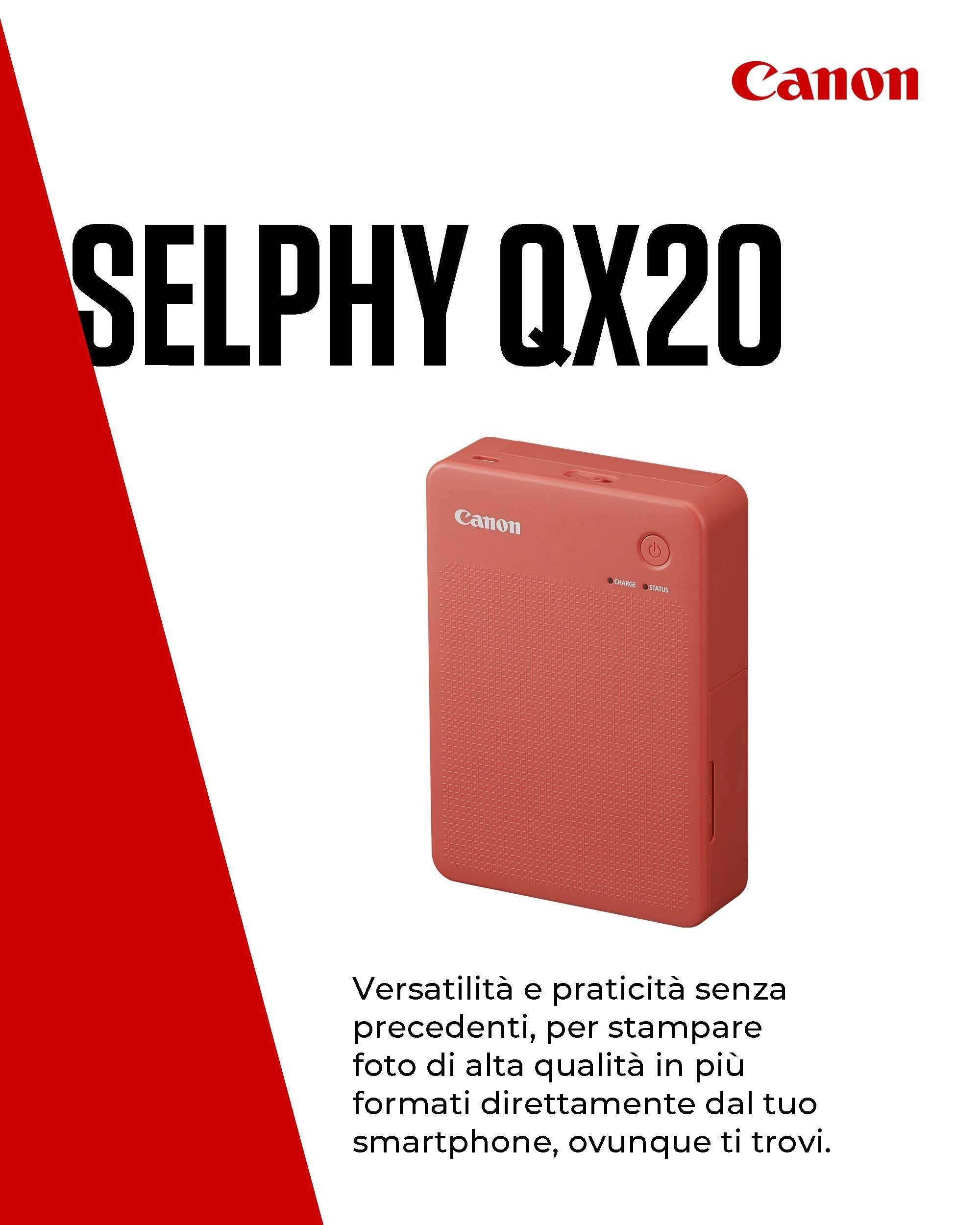 Canon Stampante portatile SELPHY QX20: stampa a sublimazione con Wi-Fi dal tuo dispositivo smart. 2 formati di stampe con adesivo rimovibile e ricarica USB-C - Rosso (Senza inchiostro/carta)