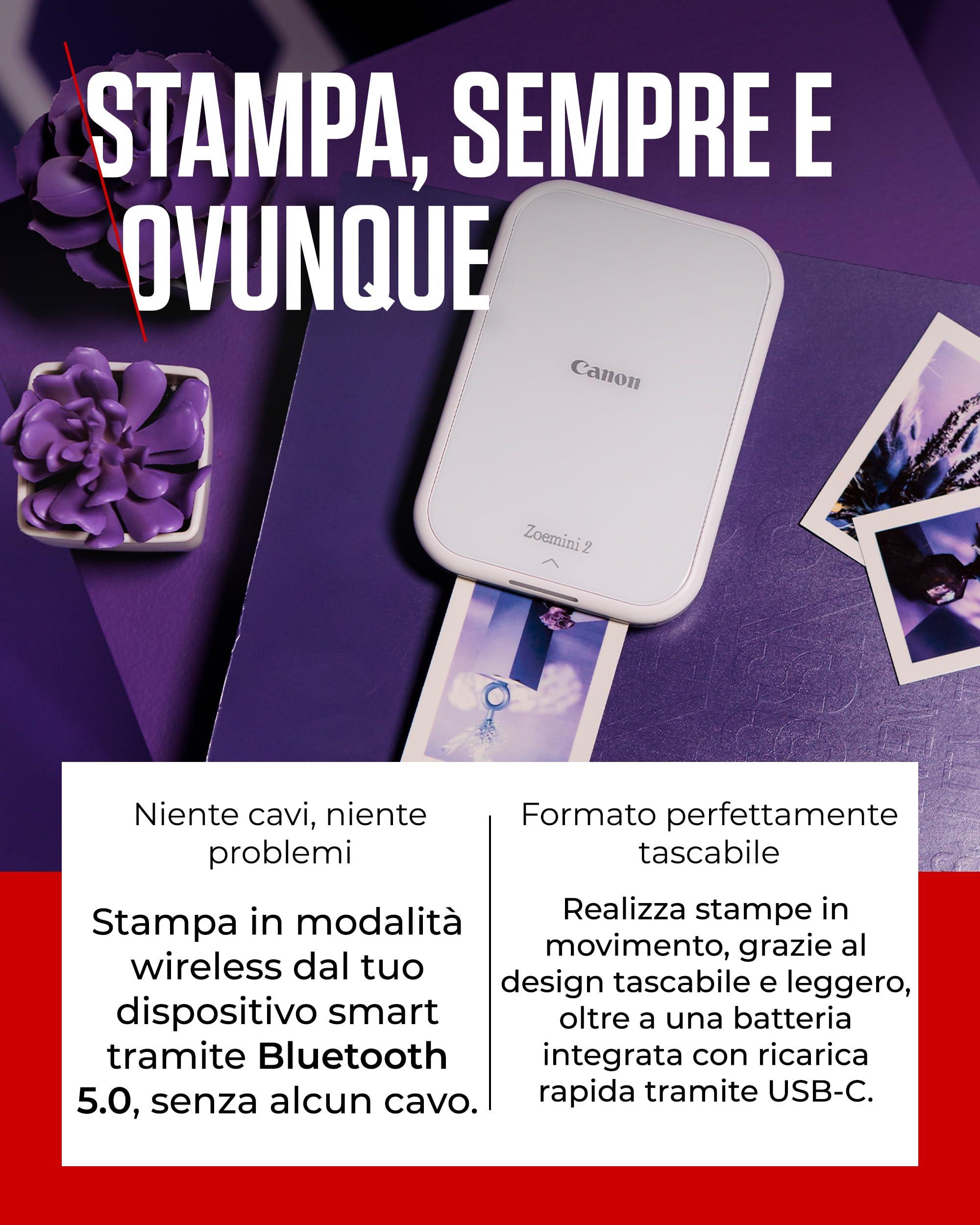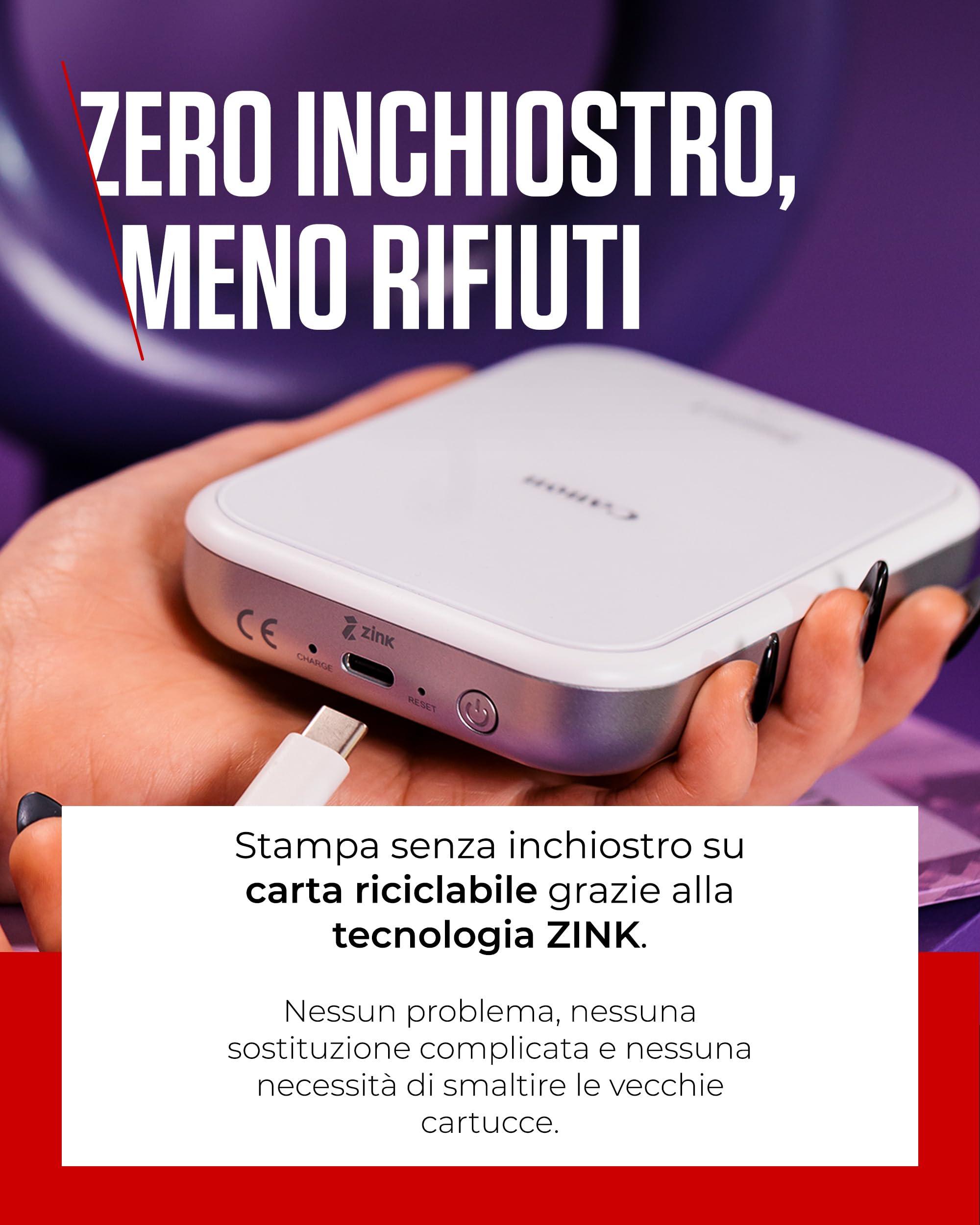 - ECOLOGICA ED EFFICIENTE: con la sua batteria integrata con ricarica USB-C, questa stampante foto portatile è sempre pronta per accompagnarti nella tua prossima avventura, senza appesantirti.