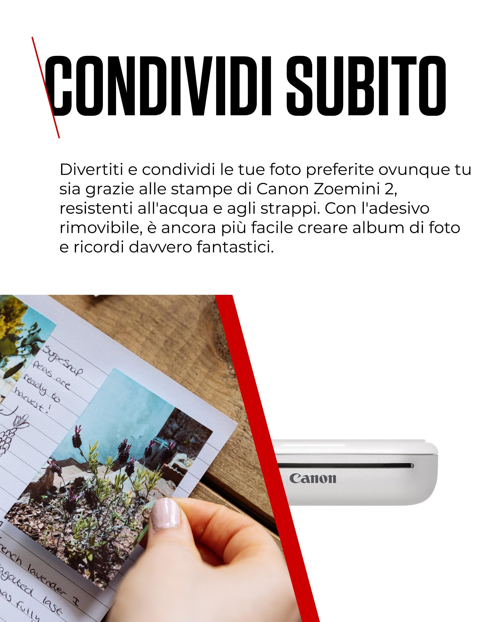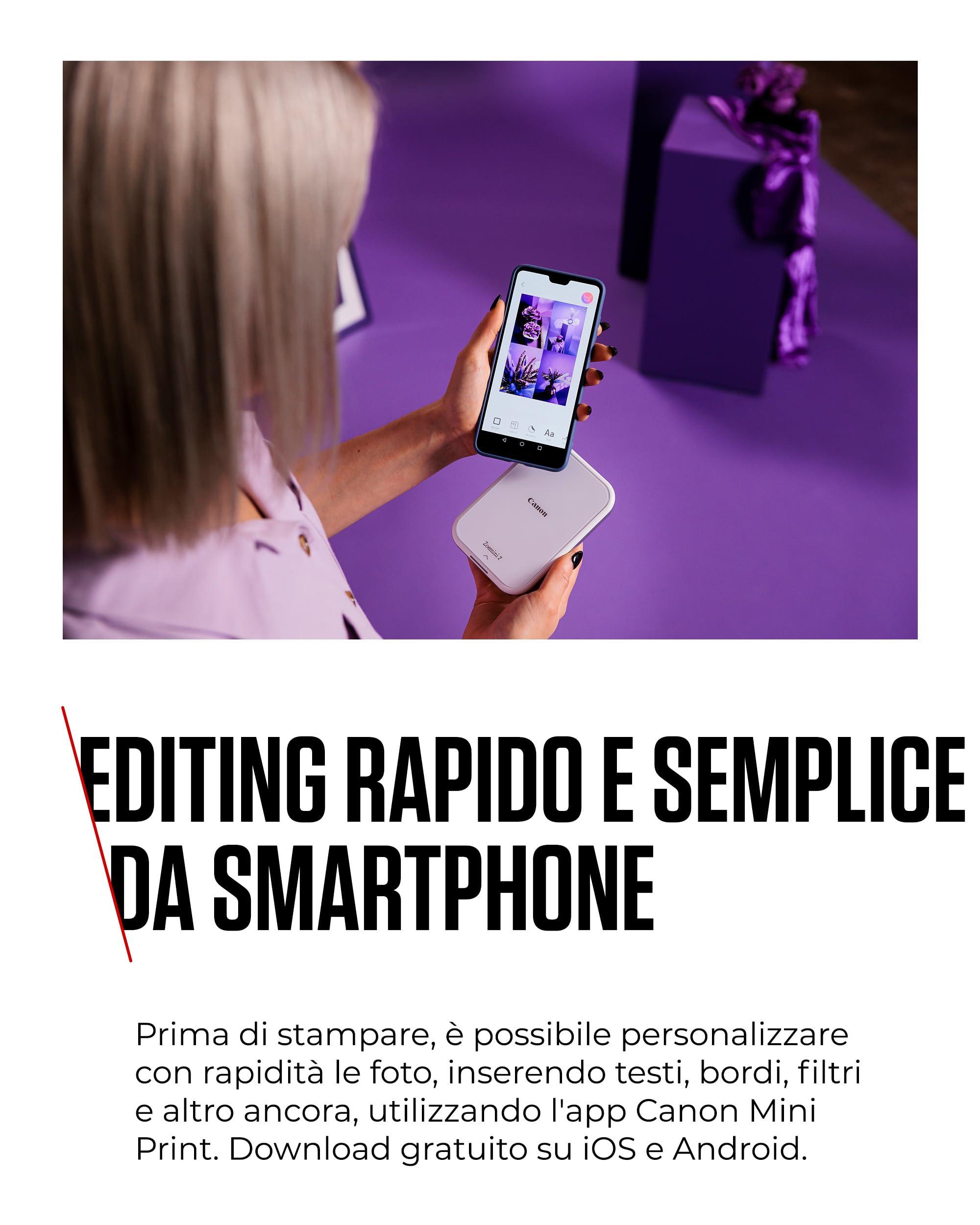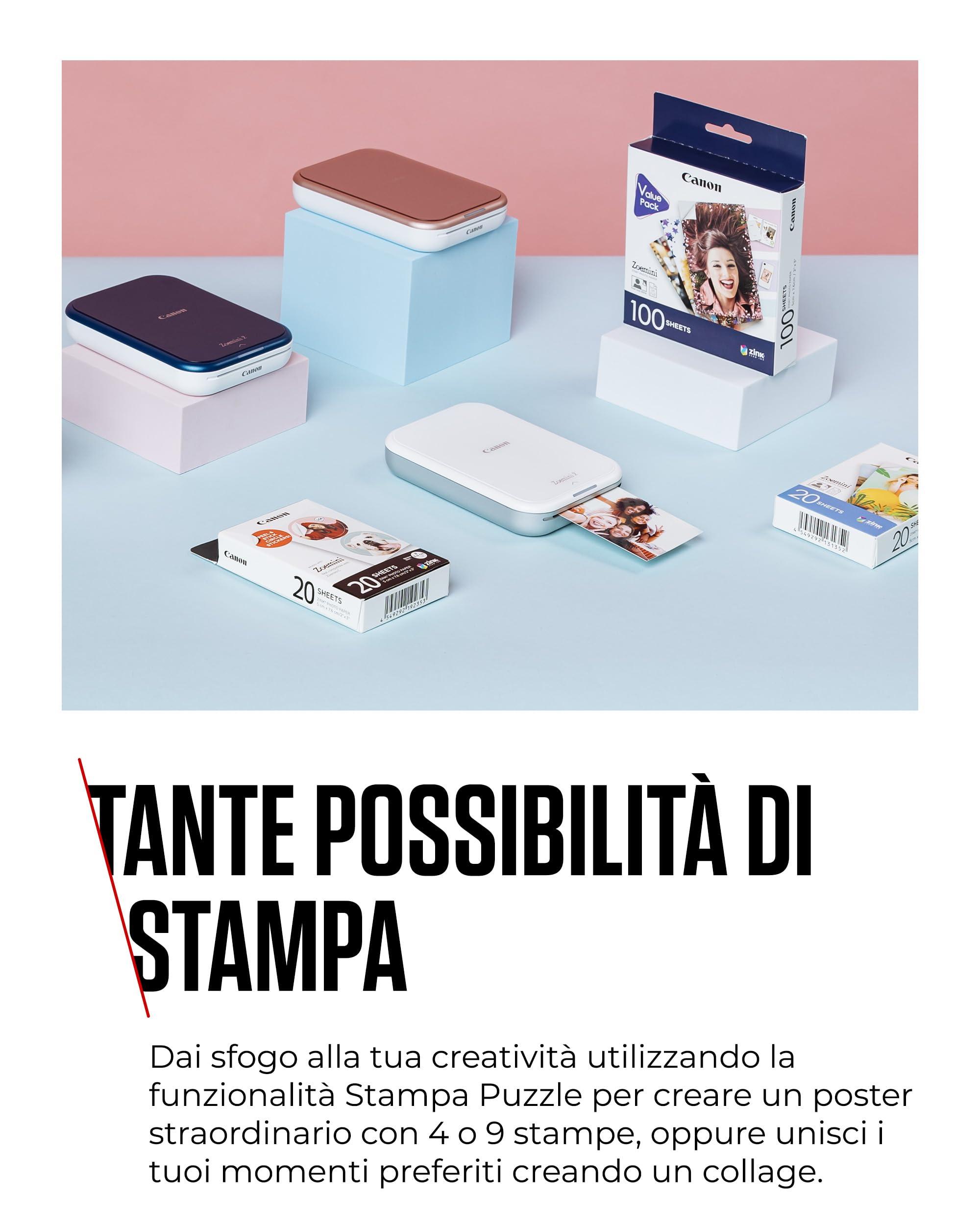 - LE TUE FOTO A MODO TUO: sfrutta l'app Canon Mini Print con questa stampante per fotografie compatta Canon, e scopri un mondo di creatività. Con stampe adesive e collage, i tuoi ricordi si muovono con te.