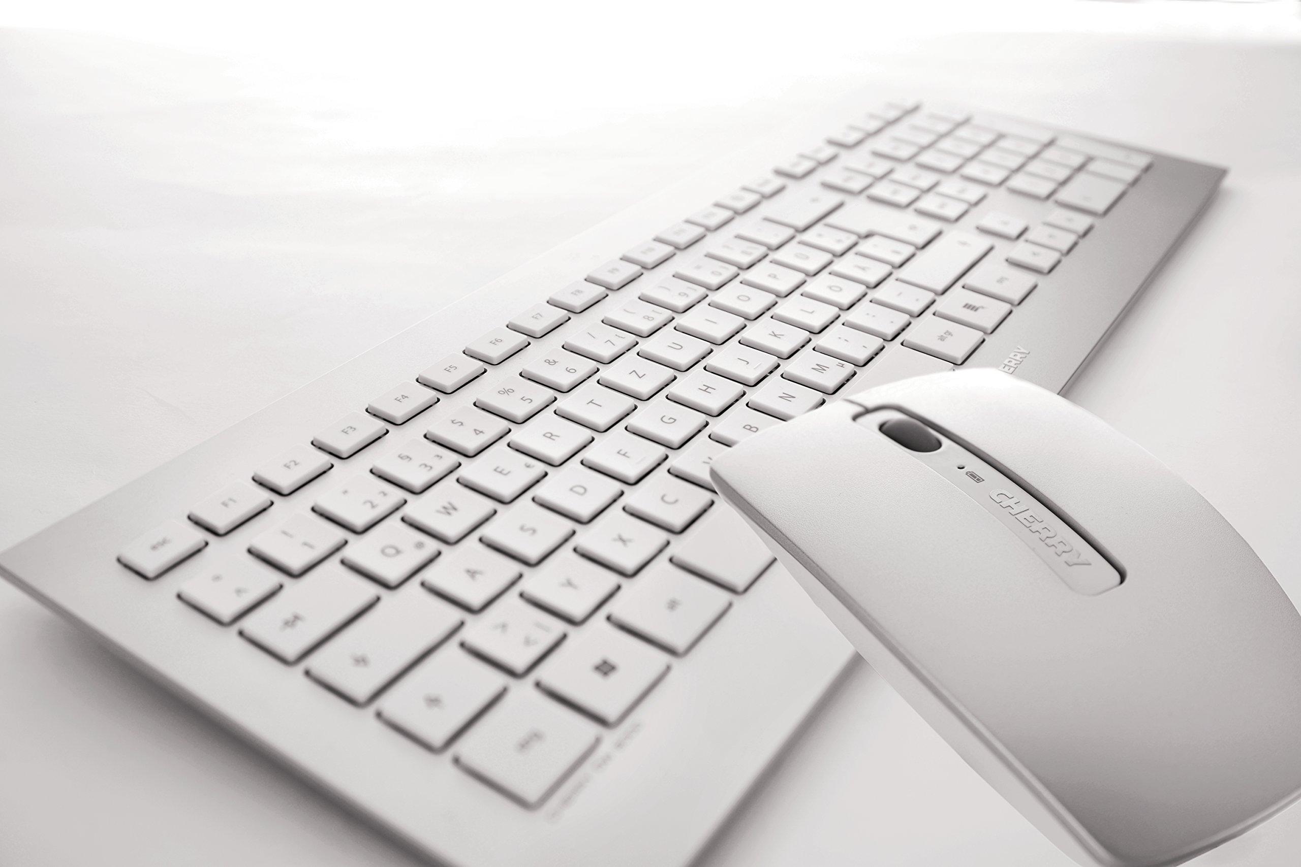 CHERRY DW 8000, Set di Tastiera e Mouse Senza Fili, Layout per la Germania (QWERTZ), Alimentazione a Batteria, Tastiera ultrapiatta, Mouse a 3 Pulsanti con Sensore a Infrarossi, Bianco-Argento