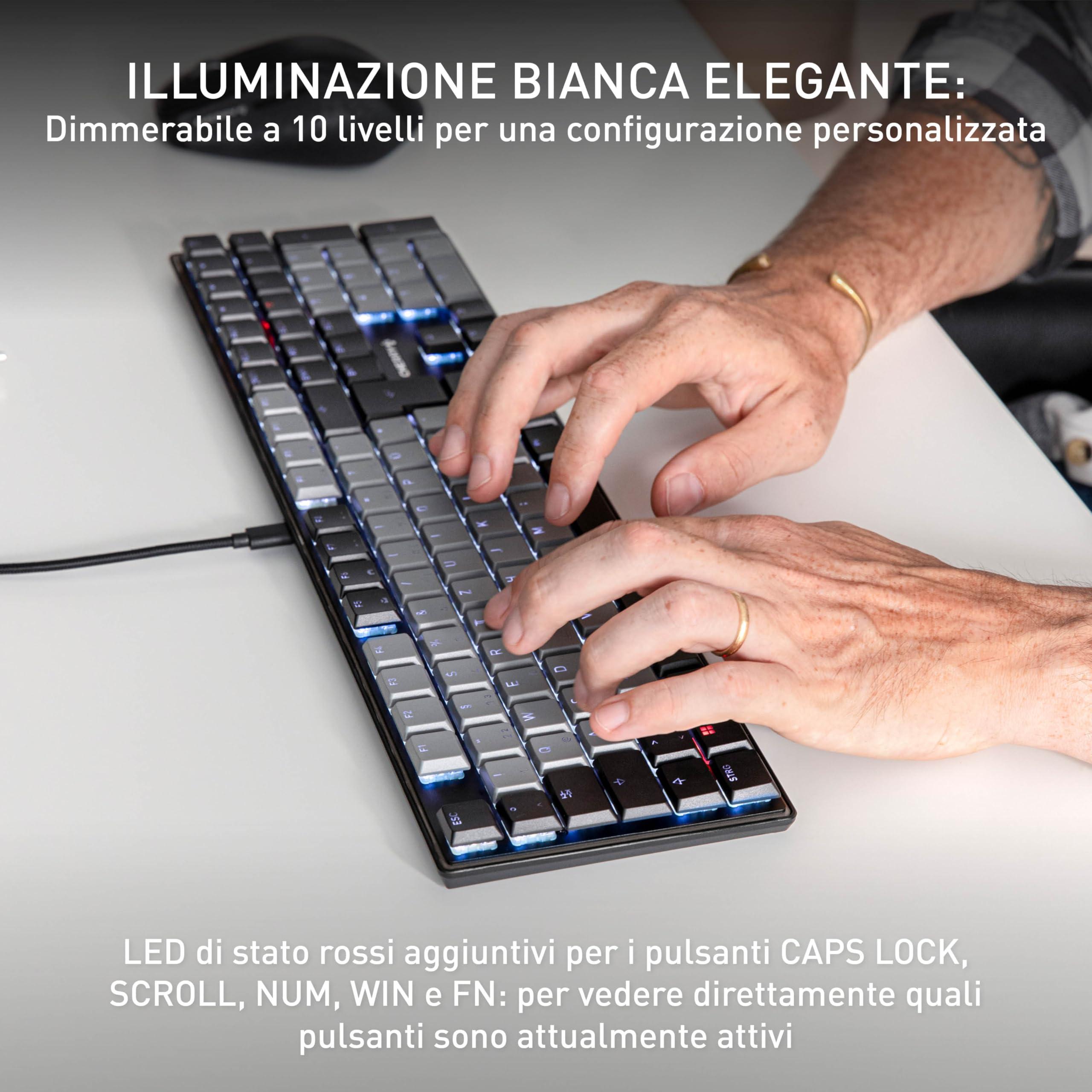 - Tastiera meccanica a filo: design sottile con altezza estremamente ridotta e superficie in metallo anodizzato, ideale per utenti esperti, programmatori, giocatori o dattilografi abituali