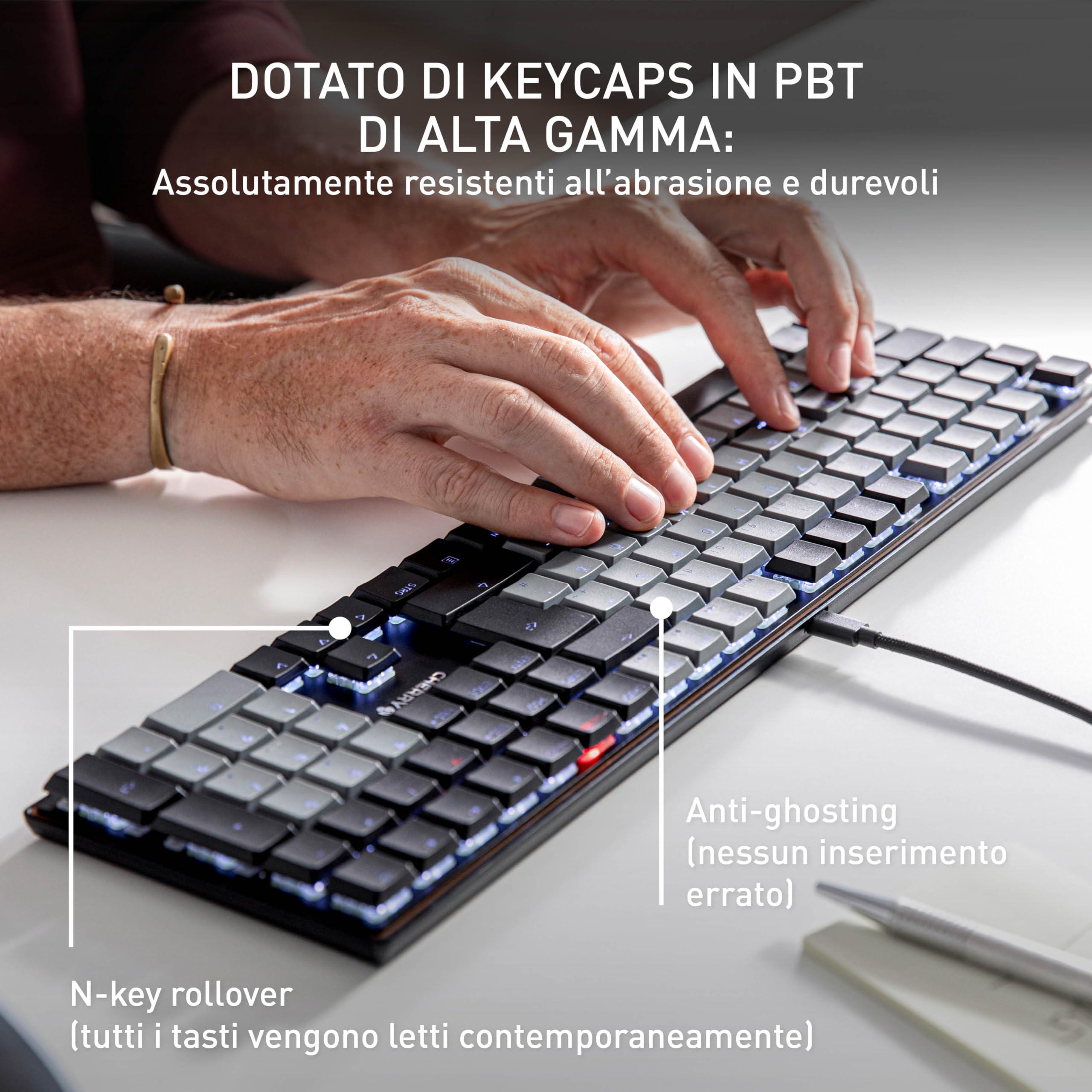 - Interruttori CHERRY MX LOW PROFILE 2.0 IVORY: sensazione di digitazione fluida e diretta con caratteristiche di commutazione lineari (nessun click) e più di 100 milioni di attuazioni per tasto