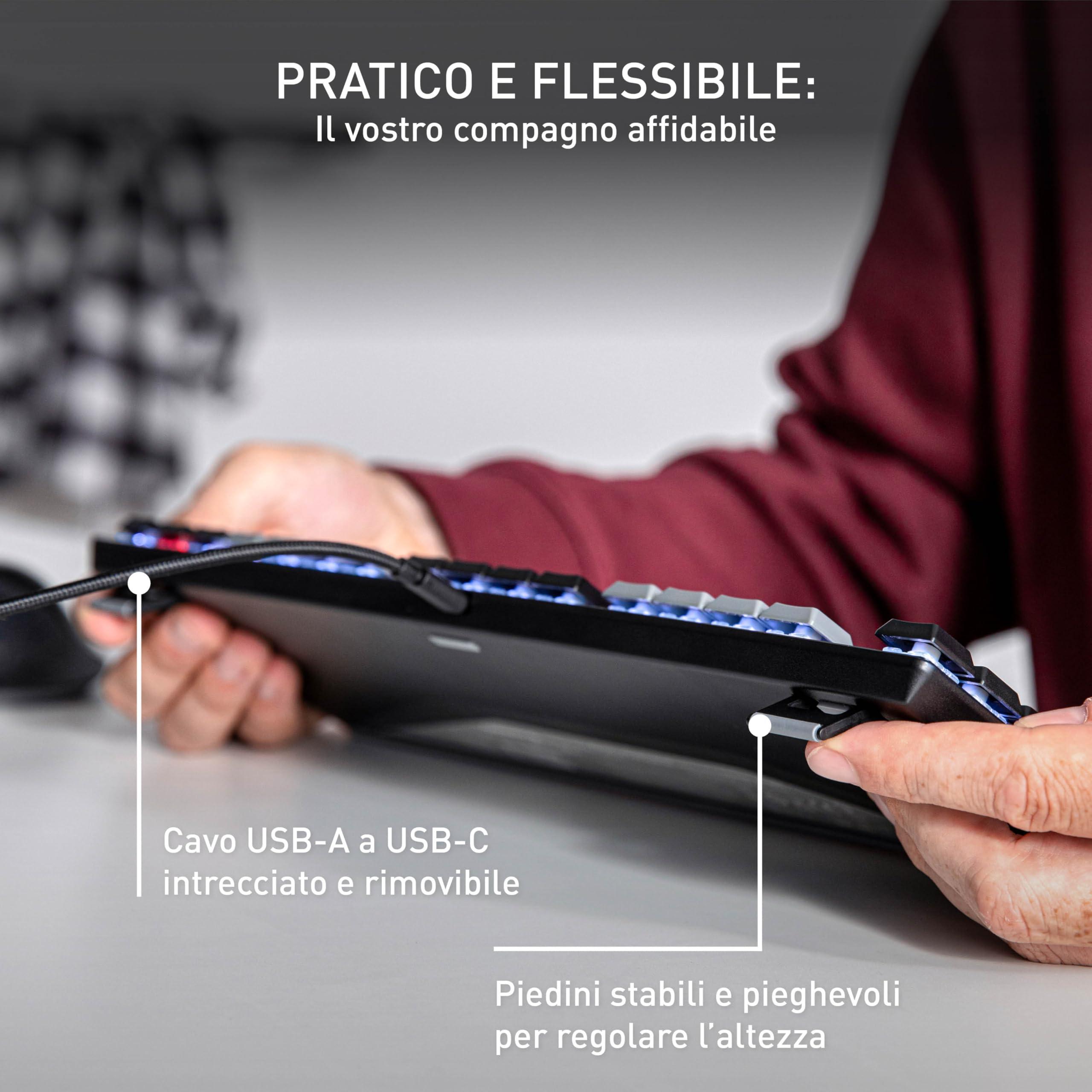 - Caratteristiche pratiche: N-key rollover completo (tutti i tasti vengono letti simultaneamente), anti-ghosting (nessuna digitazione errata), robusti piedini pieghevoli e cavo USB-A a USB-C staccabile