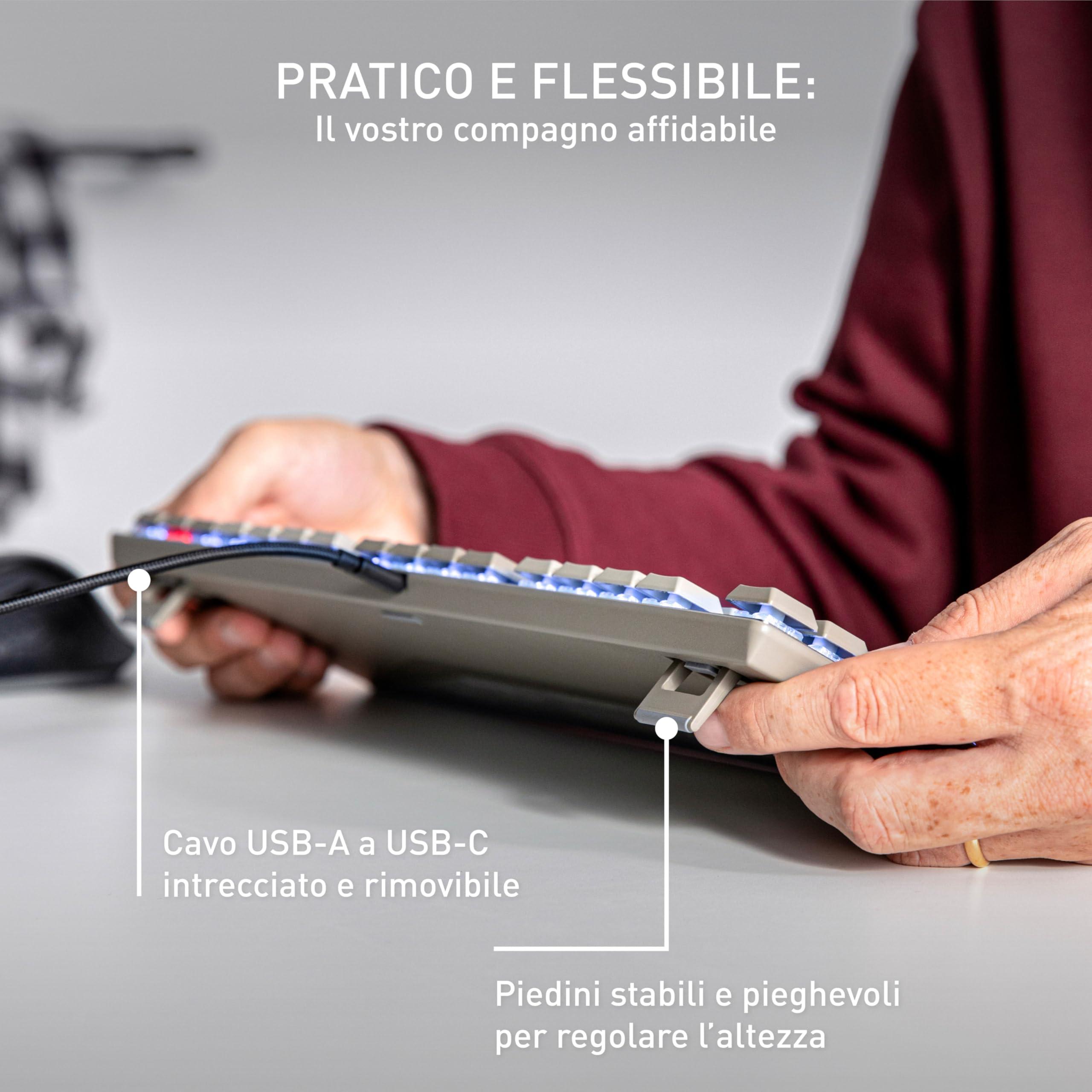 - Caratteristiche pratiche: N-key rollover completo (tutti i tasti vengono letti simultaneamente), anti-ghosting (nessuna digitazione errata), robusti piedini pieghevoli e cavo USB-A a USB-C staccabile