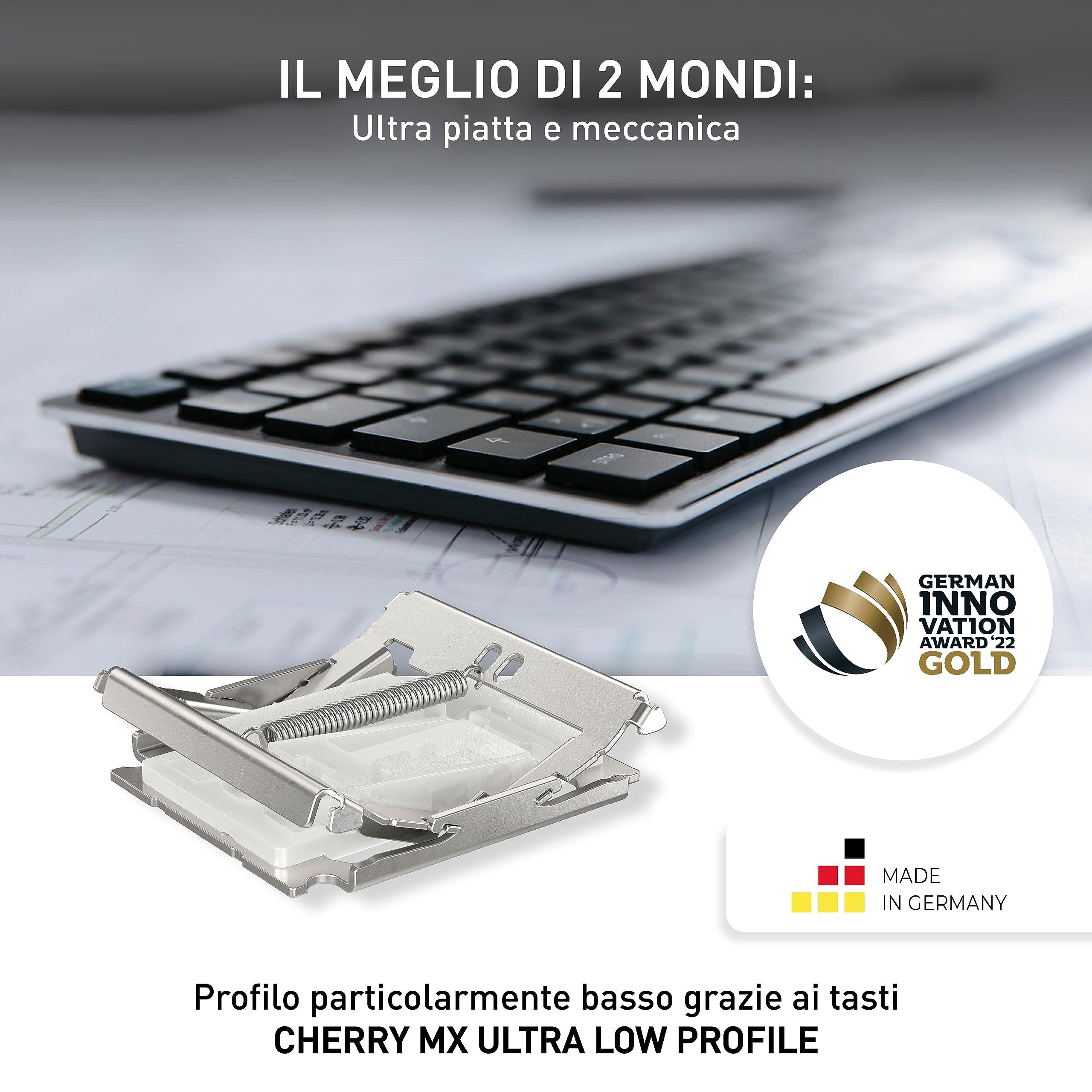 - Tastiera meccanica ultra sottile, multi-dispositivo, switch CHERRY MX ULTRA LOW PROFILE, illuminazione bianca dei tasti e LED colorati aggiuntivi, ricaricabile tramite USB-C
